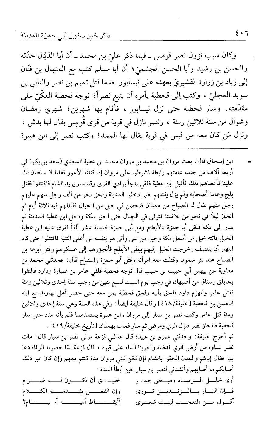 = ابن إسحاق قال: بعث مروان بن محمد بن مروان محمد بن عطية السعدي (سعد بن بكر) في أربعة آلاف من جنده عامتهم رابطة فشرطوا على مروان إذا قتلنا الأعور قفلنا لا سلطان لك علينا فأعطاهم ذلك فأقبل ابن عطية فلقي بلجًا بوادي القرى وقد سار يريد الشام فاقتتلوا فقتل بلج وعامة أصحابه ولم يزل يقتلهم حتى دخلوا المدينة ولحق نحو من ألف رجل منهم عليهم رجل منهم يقال له الصباح من همدان فتحصن في جبل من الجبال فقاتلهم فيه ثلاثة أيام ثم انحاز ليلًا في نحو من ثلاثمئة فترقى في الجبال حتى لحق بمكة ودخل ابن عطية المدينة ثم سار إلى مكة فلقي أبا حمزة بالأبطح ومع أبي حمزة خمسة عشر ألفًا ففرق عليه ابن عطية الخيل فأتته خيل من أسفل مكة وخيل من منى وأتى هو بنفسه من أعلى الثنية فاقتتلوا حتى كاد النهار أن ينتصف وخرجت الخيل إليهم ببطن الأبطح فألجؤوهم إلى عسكرهم وقتل أبرهة بن الصباح عند بئر ميمون وقتلت معه امرأته وقتل أبو حمزة واستباح قال: فحدثني محمد بن معاوية عن بيهس أبي حبيب بن حبيب قال توجه قحطبة فلقي عامر بن ضبارة وداود فالتقوا بجابلق رستاق من أصبهان في رجب يوم السبت لسبع بقين من رجب سنة إحدى وثلاثين ومئة فقتل عامر وانهزم داود فلحق بأبيه ولحق قحطبة بمن معه حتى حصر أهل نهاوند مع ابنه الحسن بن قحطبة [خليفة / ٤١٨] وقال خليفة أيضًا: وفي هذه السنة وهي سنة إحدى وثلاثين ومئة قتل عامر وكتب نصر بن سيار إلى مروان وابن هبيرة يستمدهما فلم يأته مدد حتى سار قحطبة فانحاز نصر فنزل الري ومرض ثم سار فمات بهمذان [تأريخ خليفة / ٤١٩].