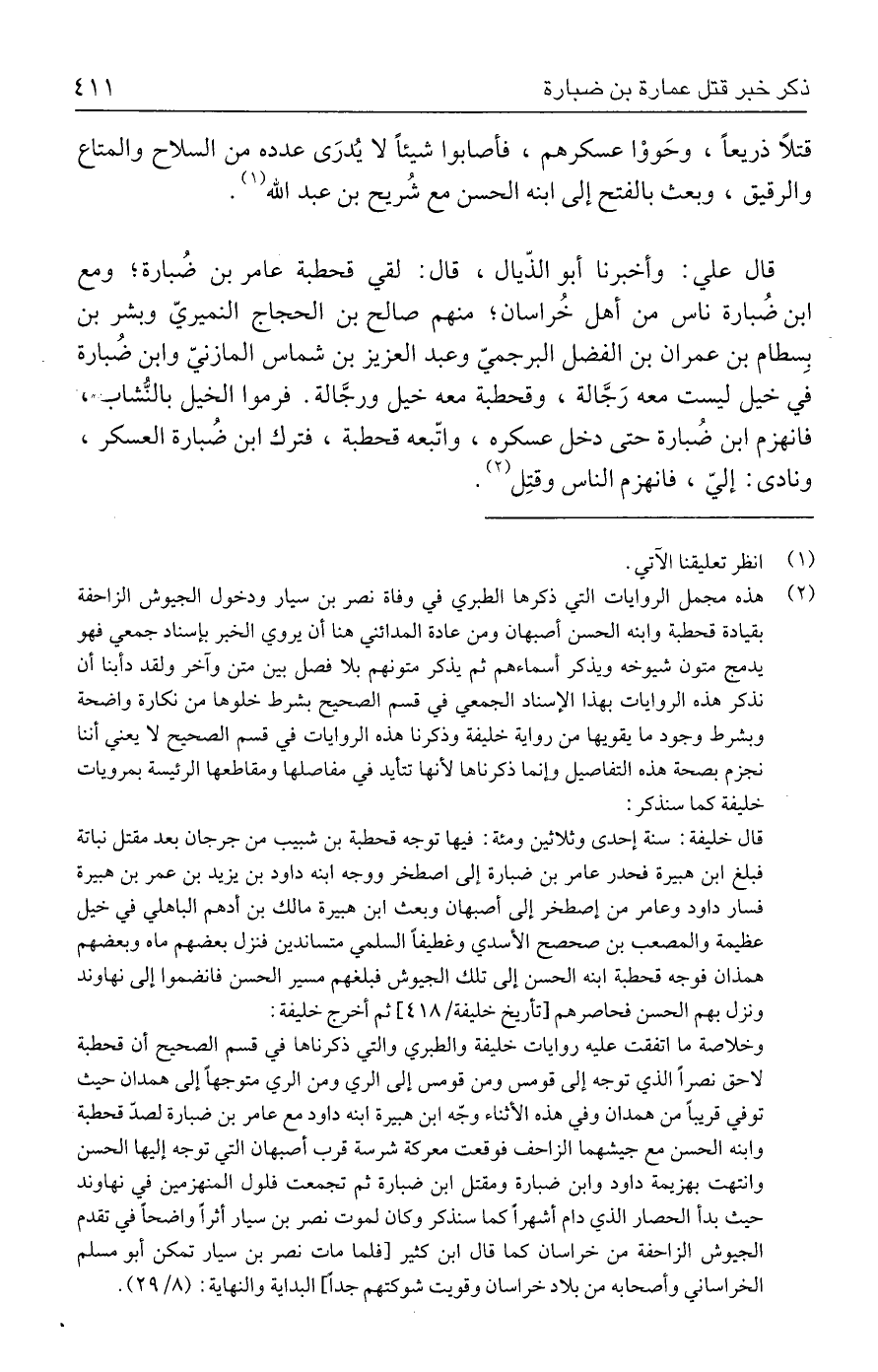 (٢) هذه مجمل الروايات التي ذكرها الطبري في وفاة نصر بن سيار ودخول الجيوش الزاحفة بقيادة قحطبة وابنه الحسن أصبهان ومن عادة المدائني هنا أن يروي الخبر بإسناد جمعي فهو يدمج متون شيوخه ويذكر أسماءهم ثم يذكر متونهم بلا فصل بين متن وآخر ولقد دأبنا أن نذكر هذه الروايات بهذا الإسناد الجمعي في قسم الصحيح بشرط خلوها من نكارة واضحة وبشرط وجود ما يقويها من رواية خليفة وذكرنا هذه الروايات في قسم الصحيح لا يعني أننا نجزم بصحة هذه التفاصيل وإنما ذكرناها لأنها تتأيد في مفاصلها ومقاطعها الرئيسة بمرويات خليفة كما سنذكر: