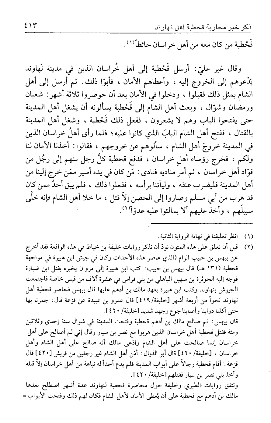 (٢) قبل أن نعلق على هذه المتون نودّ أن نذكر روايات خليفة بن خياط في هذه الواقعة فقد أخرج عن بيهس بن حبيب الرام (الذي عاصر هذه الأحداث وكان في جيش ابن هبيرة في مواجهة قحطبة (١٣١ هـ) قال بيهس بن حبيب: كتب ابن هبيرة إلى مروان يخبره بقتل ابن ضبارة فوجه إليه الحوثرة بن سهيل الباهلي من بني فراس في عشرة آلاف من قيس خاصة فاجتمعت الجيوش بنهاوند وكتب ابن هبيرة بعهد مالك بن أدهم عليها قال بيهس فحاصر قحطبة أهل نهاوند نحوًا من أربعة أشهر [خليفة / ٤١٩] قال عمرو بن عبيدة عن قزعة قال: جمرنا بها حتى أكلنا دوابنا وأصابنا جوع وجهد شديد [خليفة / ٤٢٠].