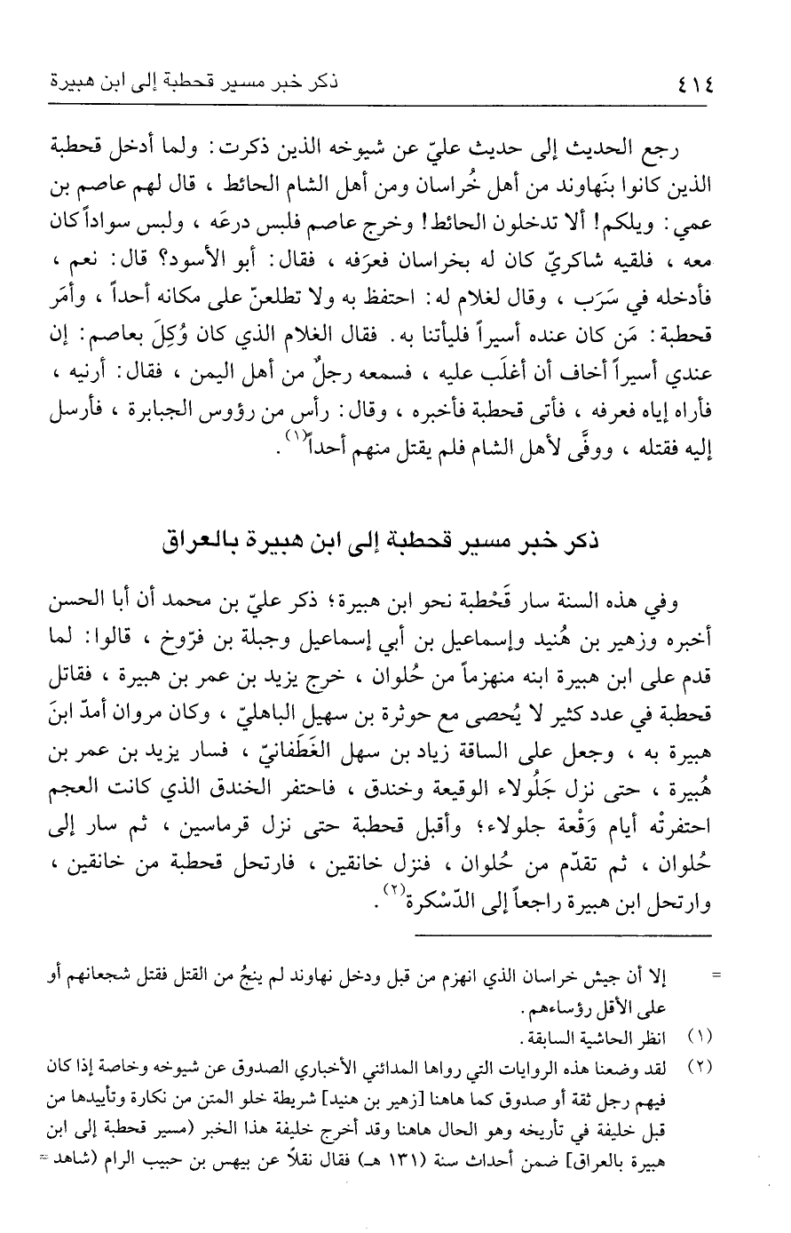 (٢) لقد وضعنا هذه الروايات التي رواها المدائني الأخباري الصدوق عن شيوخه وخاصة إذا كان فيهم رجل ثقة أو صدوق كما هاهنا أزهير بن هنيد، شربطة خلو المتن من نكارة وتأييدها من قبل خليفة في تأريخه وهو الحال هاهنا وقد أخرج خليفة هذا الخبر (مسير قحطبة إلى ابن هبيرة بالعراق] ضمن أحداث سنة (١٣١ هـ) فقال نقلًا عن بيهس بن حبيب الرام (شاهد =