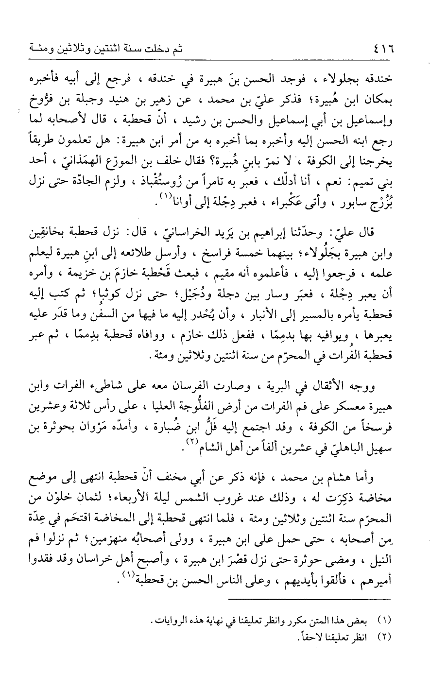 وأما هشام بن محمد، فإنه ذكر عن أبي مخنف أنّ قحطبة انتهى إلى موضع مخاضة ذكِرَت له، وذلك عند غروب الشمس ليلة الأربعاء؛ لثمان خلوْن من المحرّم سنة اثنتين وثلاثين ومئة، فلما انتهى قحطبة إلى المخاضة اقتحَم في عِدّة مِن أصحابه، حتى حمل على ابن هبيرة، وولى أصحابُه منهزمين؛ ثم نزلوا فم النيل، ومضى حوثرة حتى نزل قصْرَ ابن هبيرة، وأصبح أهل خراسان وقد فقدوا أميرهم، فألقوا بأيديهم، وعلى الناس الحسن بن قحطبة (١).