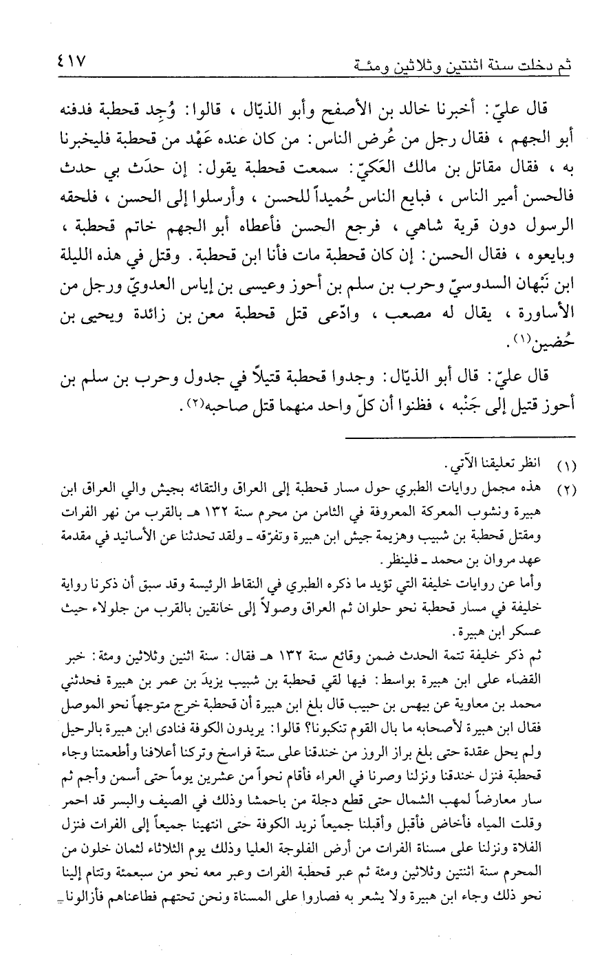 (٢) هذه مجمل روايات الطبري حول مسار قحطبة إلى العراق والتقائه بجيش والي العراق ابن هبيرة ونشوب المعركة المعروفة في الثامن من محرم سنة ١٣٢ هـ بالقرب من نهر الفرات ومقتل قحطبة بن شبيب وهزيمة جيش ابن هبيرة وتفرّقه - ولقد تحدثنا عن الأسانيد في مقدمة عهد مروان بن محمد - فلينظر.
