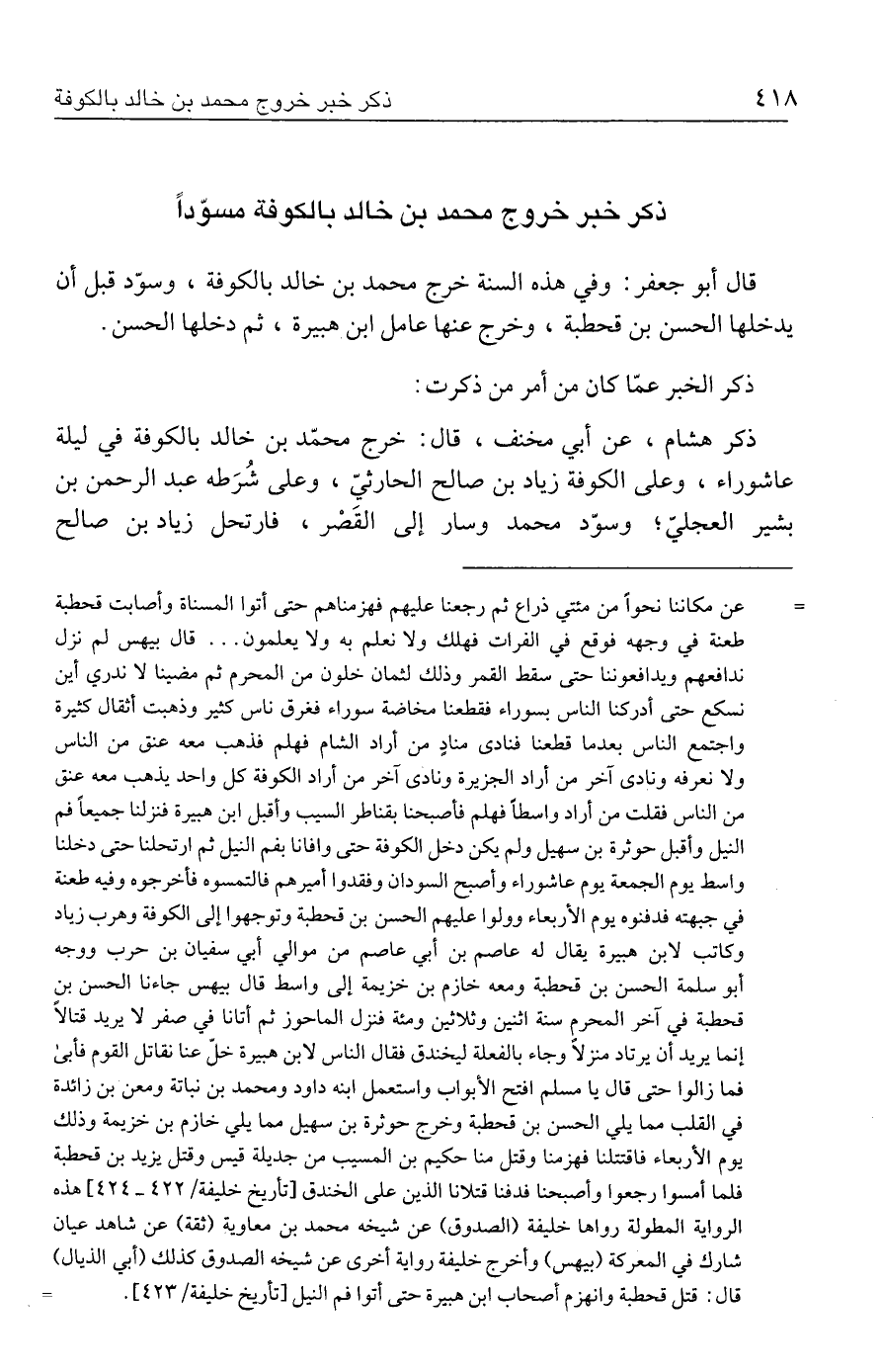 قال أبو جعفر: وفي هذه السنة خرج محمد بن خالد بالكوفة، وسوّد قبل أن يدخلها الحسن بن قحطبة، وخرج عنها عامل ابن هبيرة، ثم دخلها الحسن.