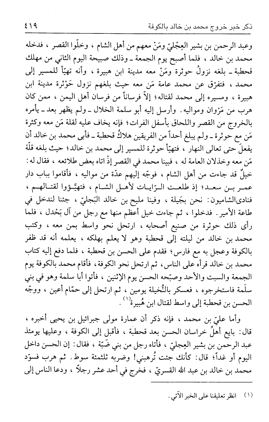 وعبد الرحمن بن بشير العِجْليّ ومَنْ معهم من أهل الشام، وخلّوا القصر، فدخله محمد بن خالد، فلما أصبح يوم الجمعة - وذلك صبيحة اليوم الثاني من مهلك قحطبة - بلغه نزولُ حوثرة ومَنْ معه مدينة ابن هبيرة، وأنه تهيّأ للمسير إلى محمد، فتفرّق عن محمد عامة مَن معه حيث بلغهم نزول حَوْثرة مدينة ابن هبيرة، ومسيره إلى محمد لقتاله، إلّا فرسانًا من فرسان أهل اليمن، ممن كان هرب من مَرْوان ومواليه. وأرسل إليه أبو سلمة الخلال - ولم يظهر بعد - يأمره بالخروج من القصر واللحاق بأسفل الفرات؛ فإنه يخاف عليه لقلة مَن معه وكثرة مَن مع حوثرة - ولم يبلغ أحدًا من الفريقين هلاكُ قحطبة - فأبى محمد بن خالد أن يفعل حتى تعالى النهار، فتهيّأ حوثرة للمسير إلى محمد بن خالد؛ حيث بلغه قلّة مَن معه وخذلان العامة له، فبينا محمد في القصر إذْ أتاه بعض طلائعه، فقال له: خيلٌ قد جاءت من أهل الشام، فوجّه إليهم عدّة من مواليه، فأقاموا بباب دار عمر بن سعد؛ إذ طلعت الرّايات لأهل الشام، فتهيَّؤوا لقتالهم، فنادى الشاميون: نحن بجَيلة، وفينا مليح بن خالد البَجليّ، جئنا لندخل في طاعة الأمير. فدخلوا، ثم جاءت خيل أعظم منها مع رجل من آل بَحْدل، فلما رأى ذلك حوثرة من صنيع أصحابه، ارتحل نحو واسط بمن معه، وكتب محمد بن خالد من ليلته إلى قحطبة وهو لا يعلم بهلكه، يعلمه أنه قد ظفر بالكوفة وعجل به مع فارس؛ فقدم على الحسن بن قحطبة، فلما دفع إليه كتاب محمد بن خالد قرأه على الناس، ثم ارتحل نحو الكوفة، فأقام محمد بالكوفة يوم الجمعة والسبت والأحد وصبّحه الحسن يوم الإثنين، فأتوا أبا سلمة وهو في بني سلَمة فاستخرجوه، فعسكر بالنُّخيلة يومين، ثم ارتحل إلى حمّام أعين، ووجّه الحسن بن قحطبة إلى واسط لقتال ابن هُبيرة (١).