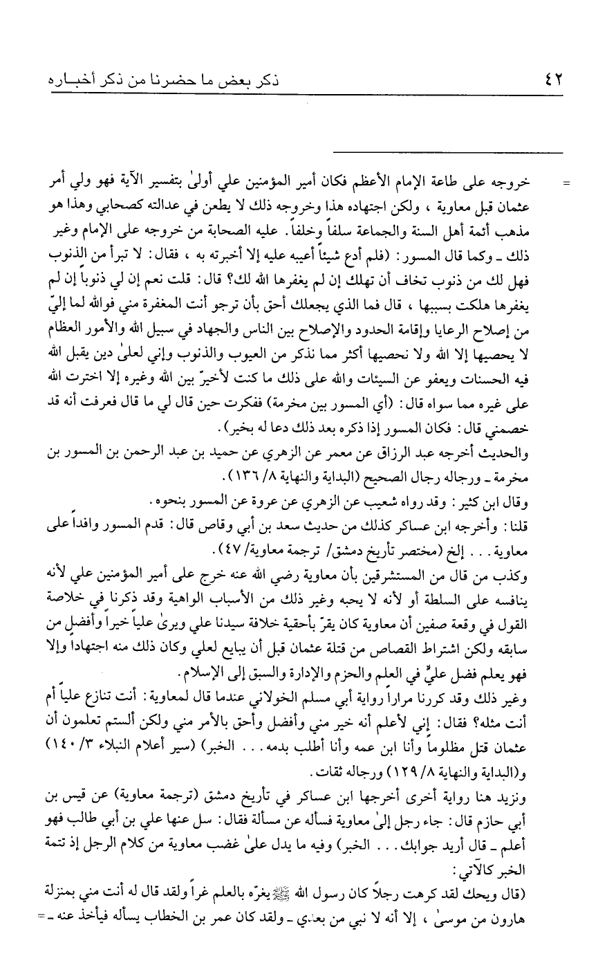 وغير ذلك وقد كررنا مرارًا رواية أبي مسلم الخولاني عندما قال لمعاوية: أنت تنازع عليًّا أم أنت مثله؟ فقال: إني لأعلم أنه خير مني وأفضل وأحق بالأمر مني ولكن ألستم تعلمون أن عثمان قتل مظلومًا وأنا ابن عمه وأنا أطلب بدمه ... الخبر) (سير أعلام النبلاء ٣/ ١٤٠) و (البداية والنهاية ٨/ ١٢٩) ورجاله ثقات.