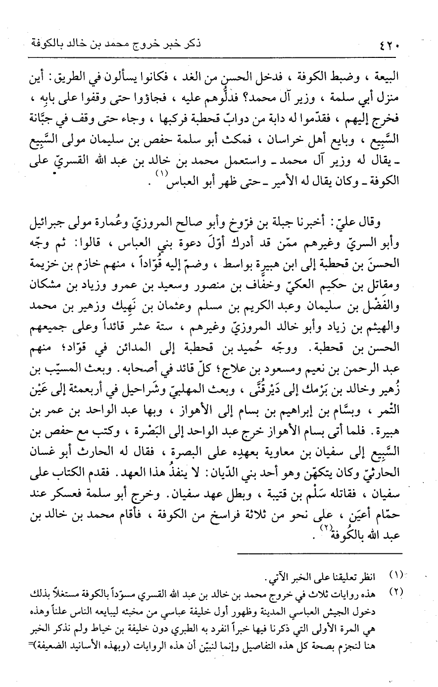 (٢) هذه روايات ثلاث في خروج محمد بن خالد بن عبد الله القسري مسوّدًا بالكوفة مستغلًا بذلك دخول الجيش العباسي المدينة وظهور أول خليفة عباسي من مخبئه ليبايعه الناس علنًا وهذه هي المرة الأولى التي ذكرنا فيها خبرًا انفرد به الطبري دون خليفة بن خياط ولم نذكر الخبر هنا لنجزم بصحة كل هذه التفاصيل وإنما لنبيّن أن هذه الروايات (وبهذه الأسانيد الضعيفة) =
