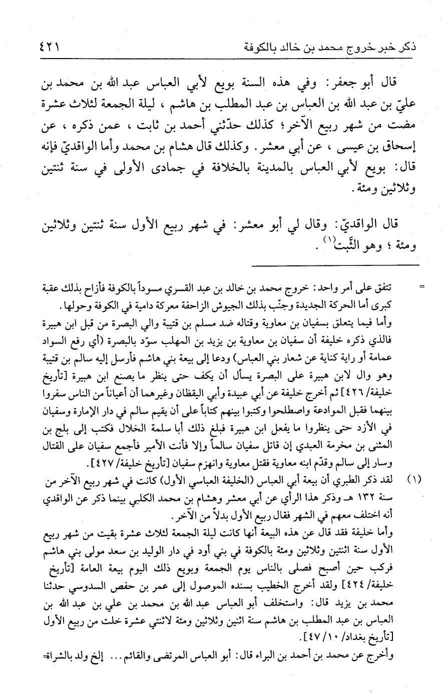 (١) لقد ذكر الطبري أن بيعة أبي العباس (الخليفة العباسي الأول) كانت في شهر ربيع الآخر من سنة ١٣٢ هـ وذكر هذا الرأي عن أبي معشر وهشام بن محمد الكلبي بينما ذكر عن الواقدي أنه اختلف معهم في الشهر فقال ربيع الأول بدلًا من الآخر.
