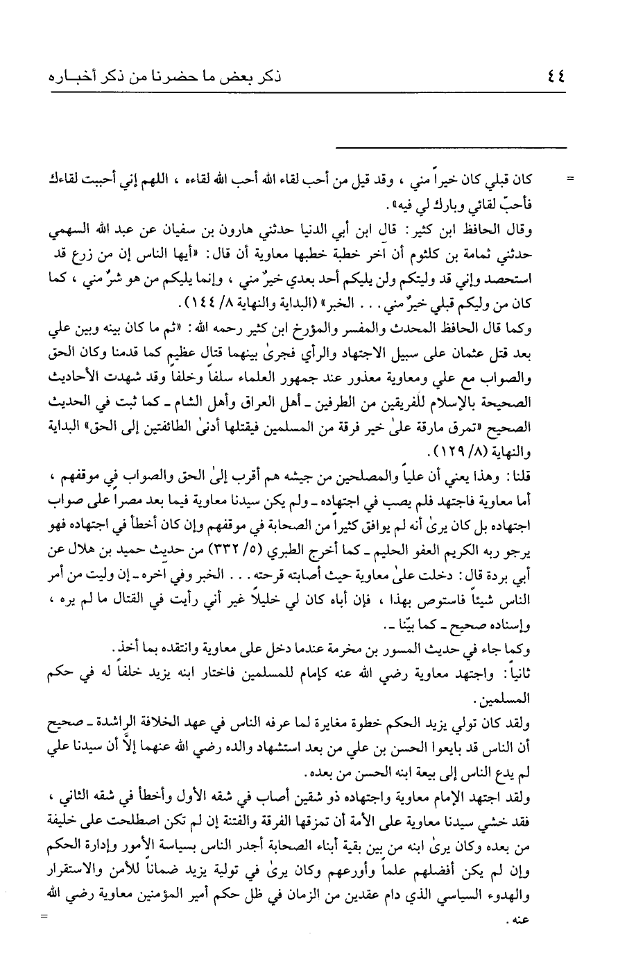 قلنا: وهذا يعني أن عليًّا والمصلحين من جيشه هم أقرب إلى الحق والصواب في موقفهم، أما معاوية فاجتهد فلم يصب في اجتهاده - ولم يكن سيدنا معاوية فيما بعد مصرًا على صواب اجتهاده بل كان يرى أنه لم يوافق كثيرًا من الصحابة في موقفهم وإن كان أخطأ في اجتهاده فهو يرجو ربه الكريم العفو الحليم -كما أخرج الطبري (٥/ ٣٣٢) من حديث حميد بن هلال عن أبي بردة قال: دخلت على معاوية حيث أصابته قرحته ... الخبر وفي آخره - إن وليت من أمر الناس شيئًا فاستوص بهذا، فإن أباه كان لي خليلًا غير أني رأيت في القتال ما لم يره، وإسناده صحيح -كما بيّنا-.