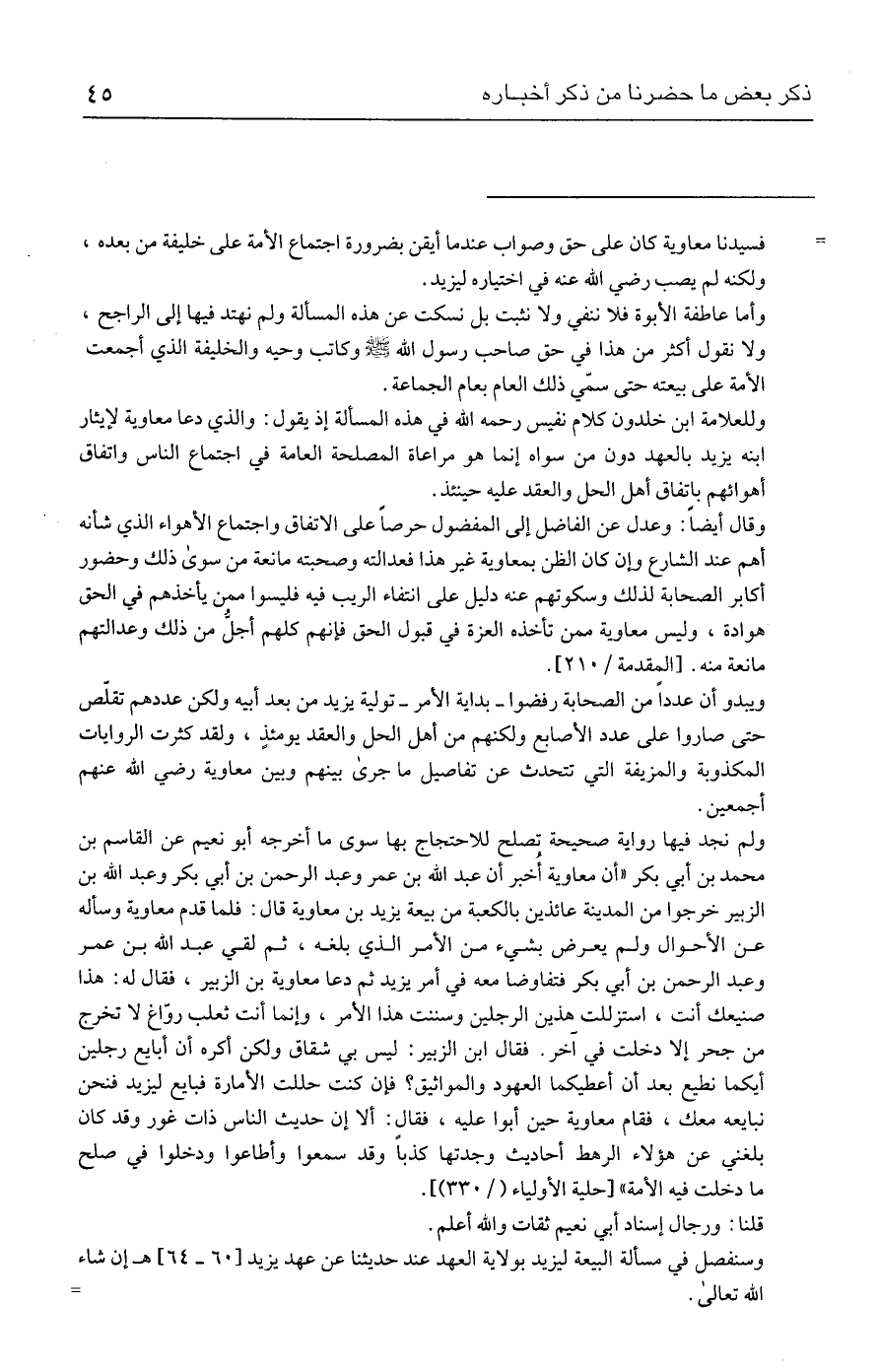 وللعلامة ابن خلدون كلام نفيس رحمه الله في هذه المسألة إذ يقول: والذي دعا معاوية لإيثار ابنه يزيد بالعهد دون من سواه إنما هو مراعاة المصلحة العامة في اجتماع الناس واتفاق أهوائهم باتفاق أهل الحل والعقد عليه حينئذ.