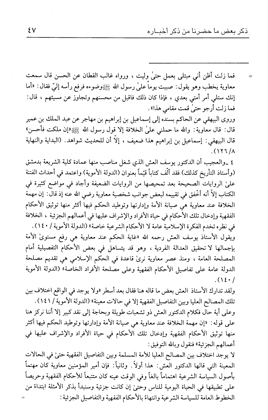 ٤ - والعجيب أن الدكتور يوسف العش الذي شغل مناصب منها عمادة كلية الشريعة بدمشق (وأستاذ التأريخ كذلك) فقد ألّف كتابًا قيّمًا بعنوان (الدولة الأموية) واعتمد في أحداث الفتنة على الروايات الصحيحة بعد تمحيصها من الروايات الضعيفة وأجاد في مواضع كثيرة في الكتاب إلّا أنه أخْفق في تقييمه لبعض جوانب شخصية معاوية - رضي الله عنه - إذ قال: إن مهمة الخلافة عند معاوية هي صيانة الأمة وإدارتها وتوطيد الحكم فيها أكثر منها توثيق الأحكام الفقهية وإدخال تلك الأحكام في حياة الأفراد والإشراف عليها في أعمالهم الجزئية، الخلافة في نظره تخدم الفكرة الإسلامية عامة لا الأحكام الشرعية خاصة" (الدولة الأموية / ١٤٠).