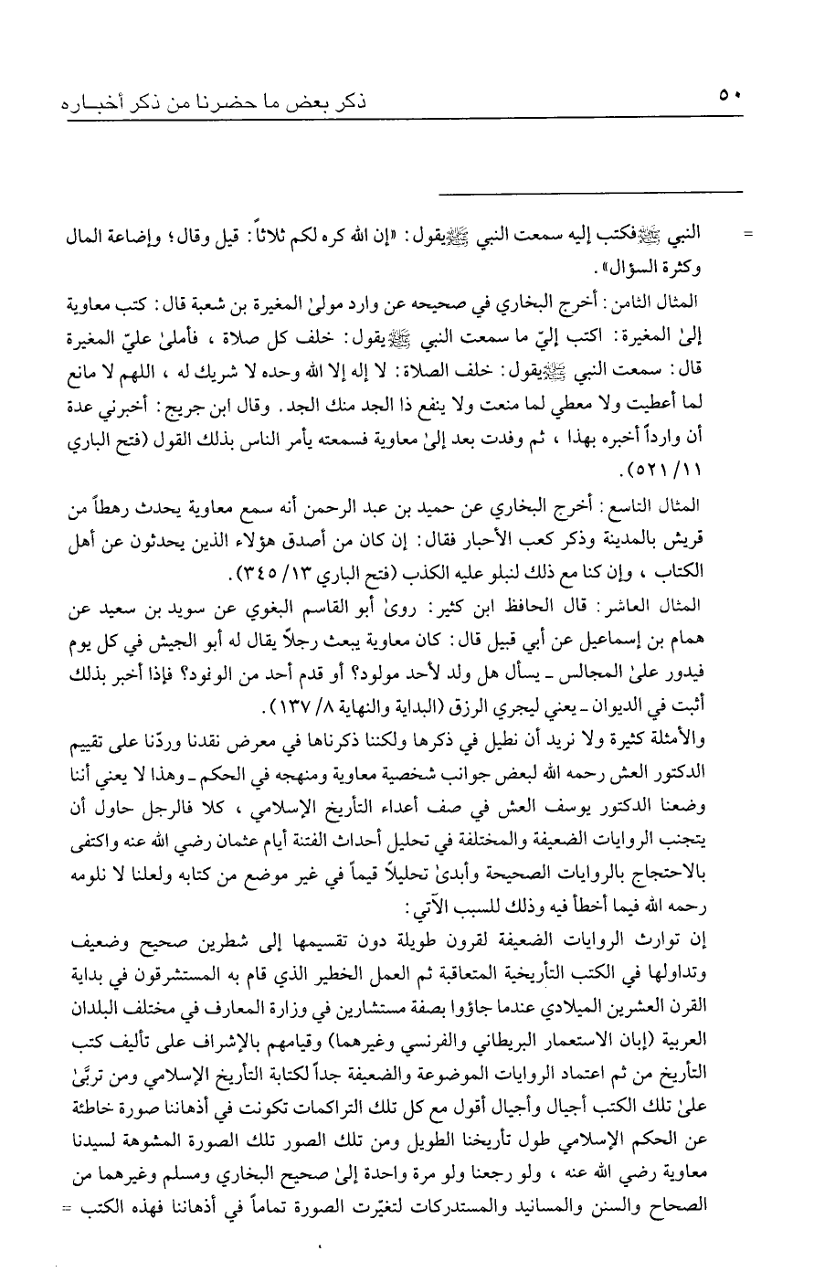 والأمثلة كثيرة ولا نريد أن نطيل في ذكرها ولكننا ذكرناها في معرض نقدنا وردّنا على تقييم الدكتور العش رحمه الله لبعض جوانب شخصية معاوية ومنهجه في الحكم - وهذا لا يعني أننا وضعنا الدكتور يوسف العش في صف أعداء التأريخ الإسلامي، كلا فالرجل حاول أن يتجنب الروايات الضعيفة والمختلفة في تحليل أحداث الفتنة أيام عثمان - رضي الله عنه - واكتفى بالاحتجاج بالروايات الصحيحة وأبدى تحليلًا قيمًا في غير موضع من كتابه ولعلنا لا نلومه رحمه الله فيما أخطأ فيه وذلك للسبب الآتي: