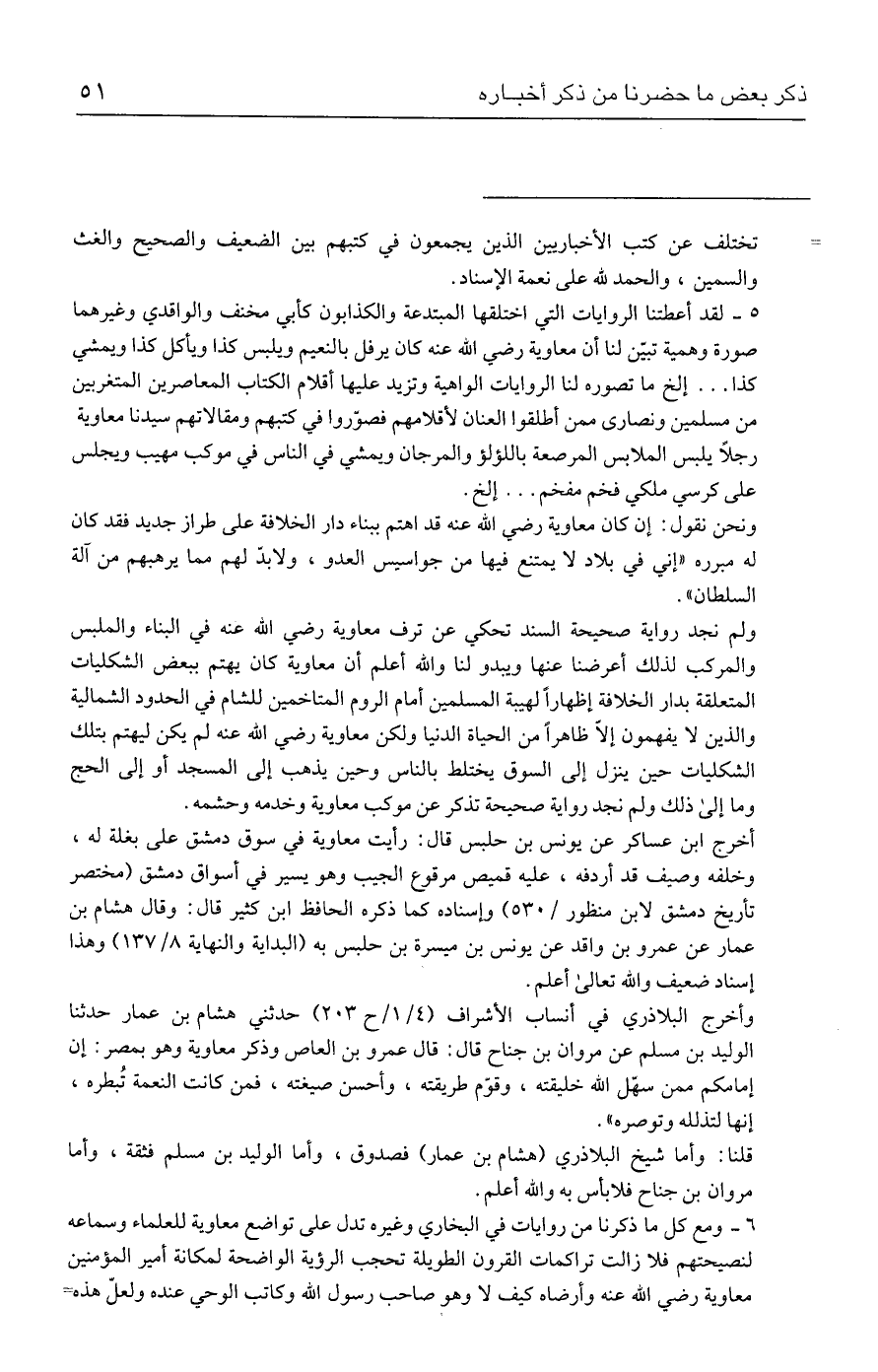 ٥ - لقد أعطتنا الروايات التي اختلقها المبتدعة والكذابون كأبي مخنف والواقدي وغيرهما صورة وهمية تبيّن لنا أن معاوية - رضي الله عنه - كان يرفل بالنعيم ويلبس كذا ويأكل كذا ويمشي كذا ... إلخ ما تصوره لنا الروايات الواهية وتزيد عليها أقلام الكتاب المعاصرين المتغربين من مسلمين ونصارى ممن أطلقوا العنان لأقلامهم فصوّروا في كتبهم ومقالاتهم سيدنا معاوية رجلًا يلبس الملابس المرصعة باللؤلؤ والمرجان ويمشي في الناس في موكب مهيب ويجلس على كرسي ملكي فخم مفخم ... إلخ.