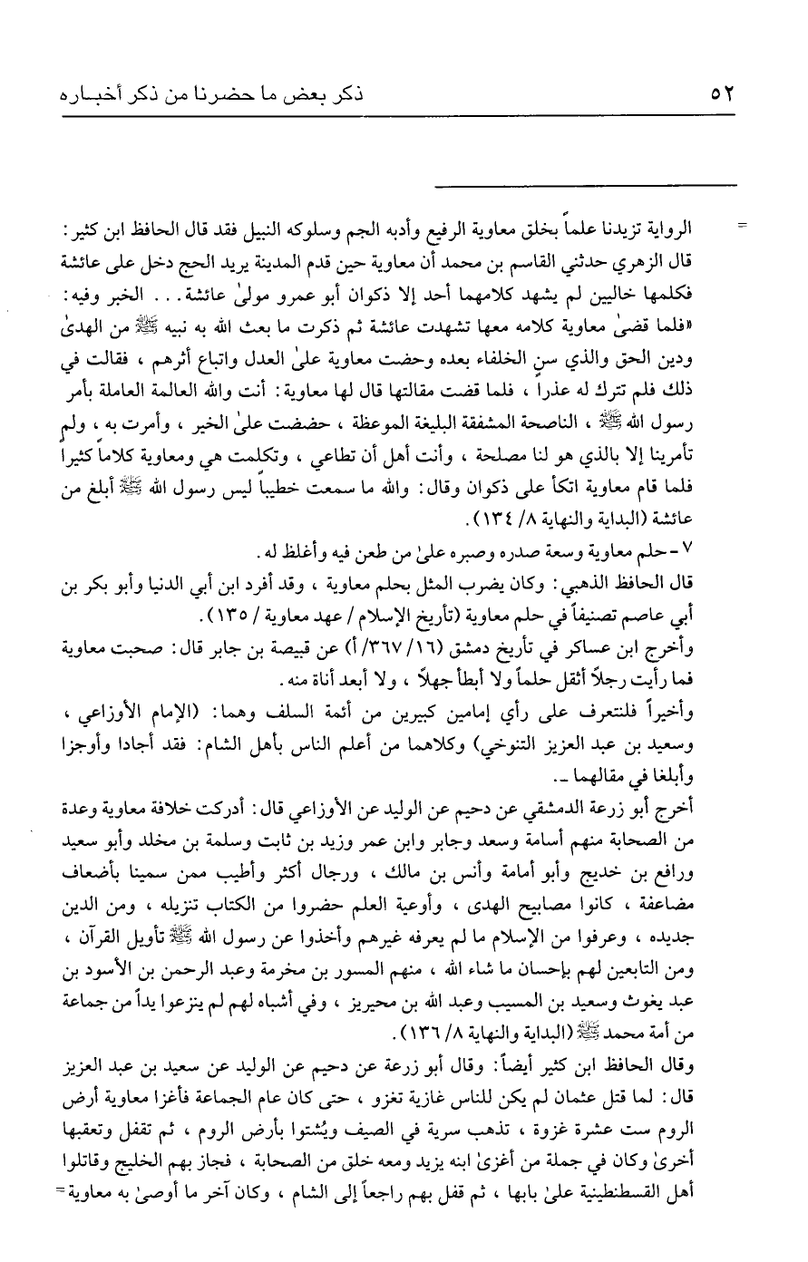 = الرواية تزيدنا علمًا بخلق معاوية الرفيع وأدبه الجم وسلوكه النبيل فقد قال الحافظ ابن كثير: قال الزهري حدثني القاسم بن محمد أن معاوية حين قدم المدينة يريد الحج دخل على عائشة فكلمها خاليين لم يشهد كلامهما أحد إلا ذكوان أبو عمرو مولى عائشة ... الخبر وفيه: "فلما قضى معاوية كلامه معها تشهدت عائشة ثم ذكرت ما بعث الله به نبيه - صلى الله عليه وسلم - من الهدى ودين الحق والذي سن الخلفاء بعده وحضت معاوية على العدل واتباع أثرهم، فقالت في ذلك فلم تترك له عذرًا، فلما قضت مقالتها قال لها معاوية: أنت والله العالمة العاملة بأمر رسول الله - صلى الله عليه وسلم -، الناصحة المشفقة البليغة الموعظة، حضضت على الخير، وأمرت به، ولم تأمرينا إلا بالذي هو لنا مصلحة، وأنت أهل أن تطاعي، وتكلمت هي ومعاوية كلامًا كثيرًا فلما قام معاوية اتكأ على ذكوان وقال: والله ما سمعت خطيبًا ليس رسول الله - صلى الله عليه وسلم - أبلغ من عائشة (البداية والنهاية ٨/ ١٣٤).