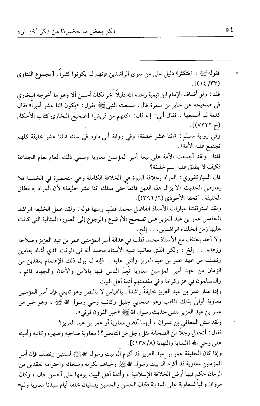 قلنا: ولو أضاف الإمام ابن تيمية رحمه الله دليلًا آخر لكان أحسن ألا وهو ما أخرجه البخاري في صحيحه عن جابر بن سمرة قال: سمعت النبي - صلى الله عليه وسلم - يقول: "يكون اثنا عشر أميرًا" فقال كلمة لم أسمعها، فقال أبي: إنه قال: "كلهم من قريش" [صحيح البخاري كتاب الأحكام (ح ٧٢٢٢)].