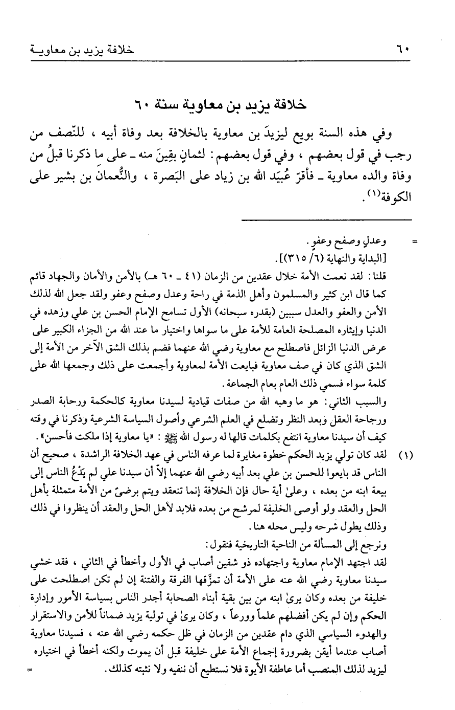 (١) لقد كان تولي يزيد الحكم خطوة مغايرة لما عرفه الناس في عهد الخلافة الراشدة، صحيح أن الناس قد بايعوا للحسن بن علي بعد أبيه - رضي الله عنهما - إلّا أن سيدنا علي لم يَدْعُ الناس إلى بيعة ابنه من بعده، وعلى أية حال فإن الخلافة إنما تنعقد ويتم برضيّ من الأمة متمثلة بأهل الحل والعقد ولو أوصى الخليفة لمرشح من بعده فلا بد لأهل الحل والعقد أن ينظروا في ذلك وذلك يطول شرحه وليس محله هنا.