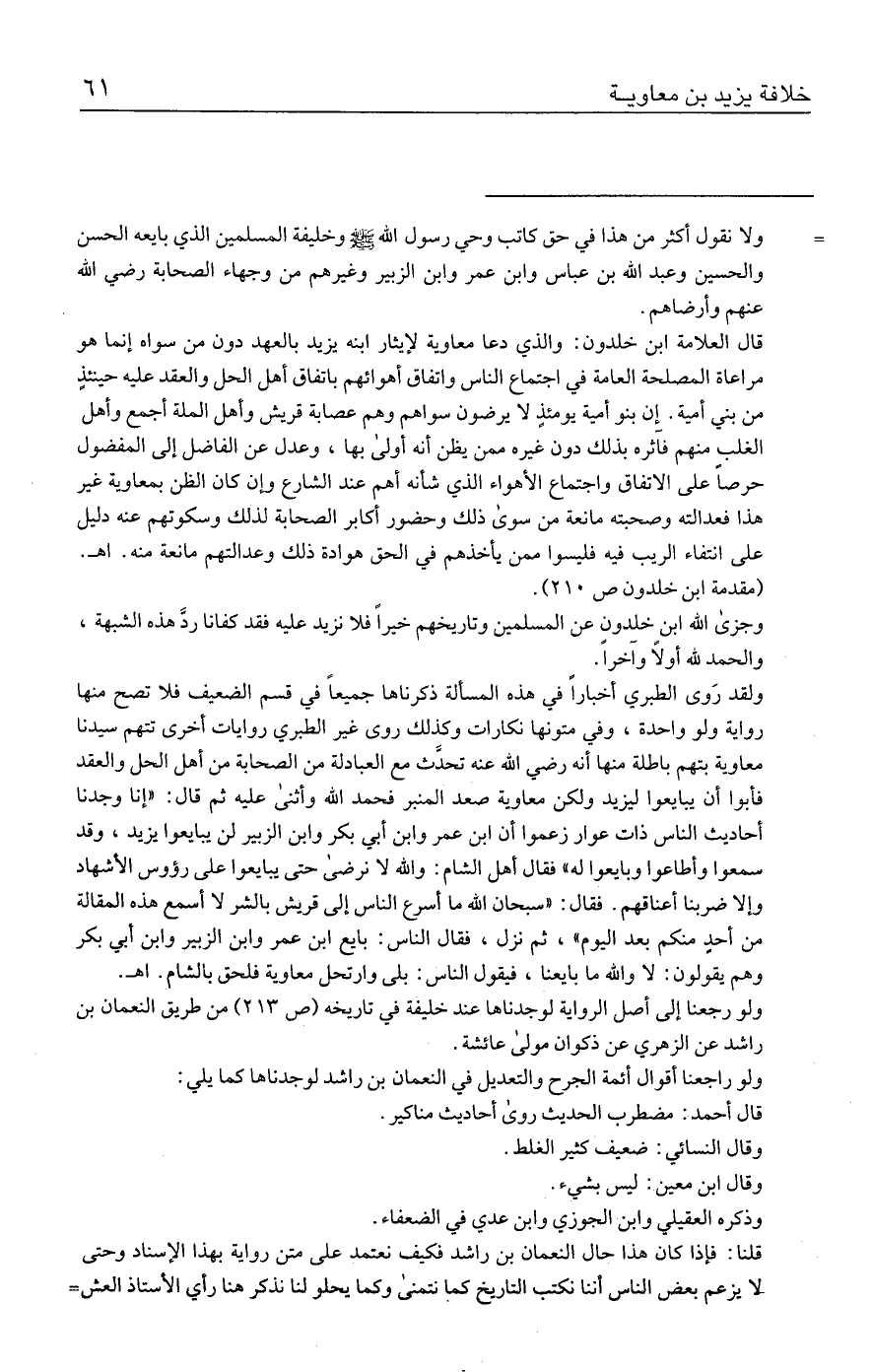 قال العلامة ابن خلدون: والذي دعا معاوية لإيثار ابنه يزيد بالعهد دون من سواه إنما هو مراعاة المصلحة العامة في اجتماع الناس واتفاق أهوائهم باتفاق أهل الحل والعقد عليه حينئذٍ من بني أمية. إن بنو أمية يومئذٍ لا يرضون سواهم وهم عصابة قريش وأهل الملة أجمع وأهل الغلب منهم فآثره بذلك دون غيره ممن يظن أنه أولى بها، وعدل عن الفاضل إلى المفضول حرصًا على الاتفاق واجتماع الأهواء الذي شأنه أهم عند الشارع وإن كان الظن بمعاوية غير هذا فعدالته وصحبته مانعة من سوى ذلك وحضور أكابر الصحابة لذلك وسكوتهم عنه دليل على انتفاء الريب فيه فليسوا ممن يأخذهم في الحق هوادة ذلك وعدالتهم مانعة منه. اهـ. (مقدمة ابن خلدون ص ٢١٠).