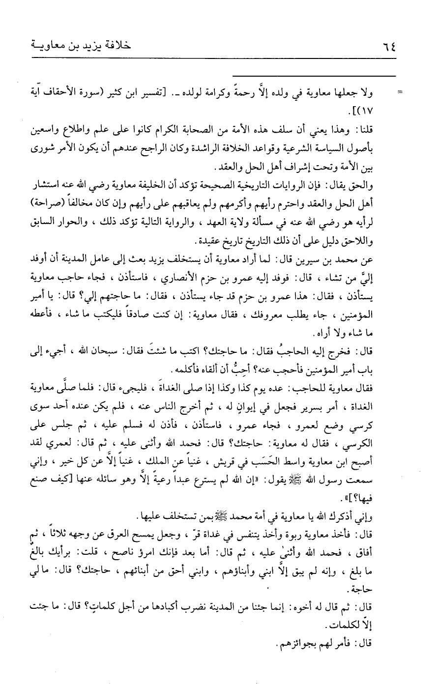 = ولا جعلها معاوية في ولده إلَّا رحمةً وكرامة لولده -. [تفسير ابن كثير (سورة الأحقاف آية ١٧)].