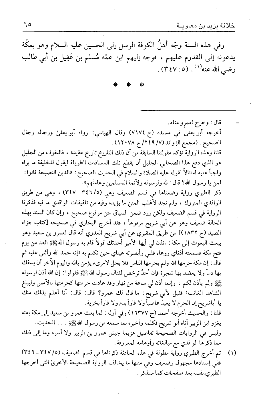 قلنا: والحديث أخرجه أحمد (ح ١٦٣٧٧) وفي أوله: لما بعث عمرو بن سعيد إلى مكة بعثه يغزو ابن الزبير أتاه أبو شريح فكلمه وأخبره بما سمعه من رسول الله - صلى الله عليه وسلم - ... الحديث. وليس في الروايات الصحيحة تفاصيل هزيمة جيش عمرو بن الزبير ولا أسره وما إلى ذلك مما ذكرها الواقدي مع مبالغاته وأوهامه المعروفة.