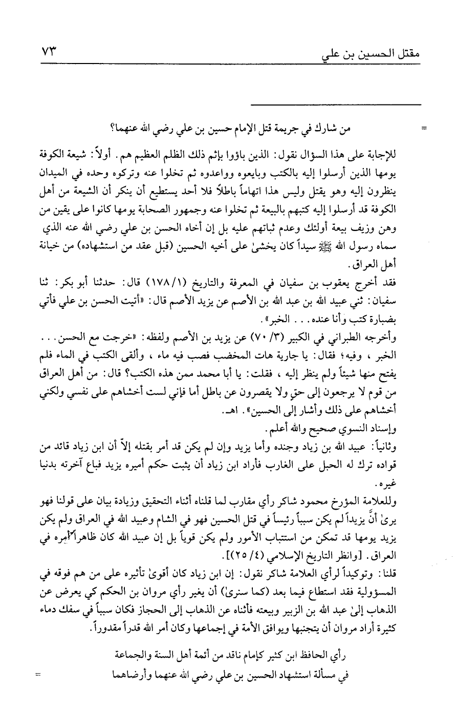 وللعلامة المؤرخ محمود شاكر رأي مقارب لما قلناه أثناء التحقيق وزيادة بيان على قولنا فهو يرى أن يزيدًا لم يكن سببًا رئيسًا في قتل الحسين فهو في الشام وعبيد الله في العراق ولم يكن يزيد يومها قد تمكن من استتباب الأمور ولم يكن قويًّا بل إن عبيد الله كان ظاهرًا أمره في العراق. [وانظر التاريخ الإسلامي (٤/ ٢٥)].