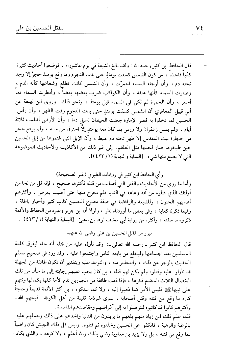 = قال الحافظ ابن كثير رحمه الله: ولقد بالغ الشيعة في يوم عاشوراء، فوضعوا أحاديث كثيرة كذبًا فاحشًا، من كون الشمس كسفت يومئذِ حتى بدت النجوم وما رفع يومئذ حجرٌ إلا وجد تحته دم، وأن أرجاء السماء احمرّت، وأن الشمس كانت تطلع وشعاعها كأنه الدم، وصارت السماء كأنها علقة، وأن الكواكب ضرب بعضها بعضًا، وأمطرت السماء دمًا أحمر، وأن الحمرة لم تكن في السماء قبل يومئذ، ونحو ذلك. وروى ابن لهيعة عن أبي قبيل المعافري أن الشمس كسفت يومئذٍ حتى بدت النجوم وقت الظهر، وأن رأس الحسين لما دخلوا به قصر الإمارة جعلت الحيطان تسيل دمًا، وأن الأرض أظلمت ثلاثة أيام، ولم يمس زعفران ولا ورس بما كان معه يومئذٍ إلَّا احترق من مسه، ولم يرفع حجر من حجارة بيت المقدس إلَّا ظهر تحته دم عبيط، وأن الإبل التي غنموها من إبل الحسين حين طبخوها صار لحمها مثل العلقم. إلى غير ذلك من الأكاذيب والأحاديث الموضوعة التي لا يصح منها شيء. [البداية والنهاية (٦/ ٤٢٣)].