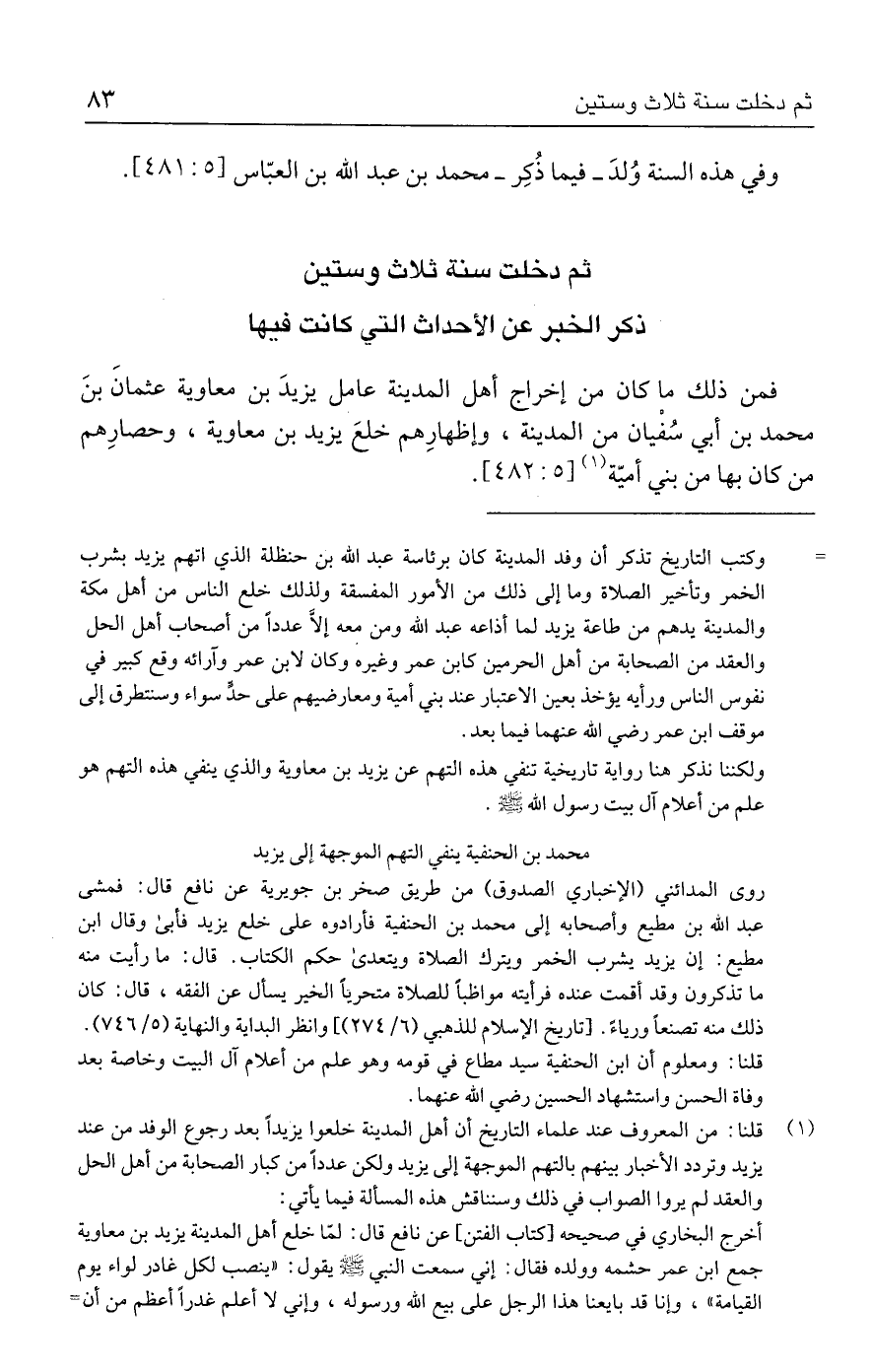 (١) قلنا: من المعروف عند علماء التاريخ أن أهل المدينة خلعوا يزيدًا بعد رجوع الوفد من عند يزيد وتردد الأخبار بينهم بالتهم الموجهة إلى يزيد ولكن عددًا من كبار الصحابة من أهل الحل والعقد لم يروا الصواب في ذلك وسنناقش هذه المسألة فيما يأتي: