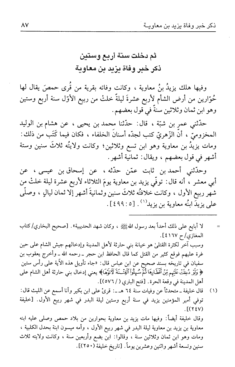 (١) قال خليفة -متحدثًا عن وفيات سنة ٦٤ هـ-: قرئ على ابن بكير وأنا أسمع عن الليث قال: توفي أمير المؤمنين يزيد في سنة أربع وستين ليلة البدر في شهر ربيع الأول. [خليفة (٢٤٧)].