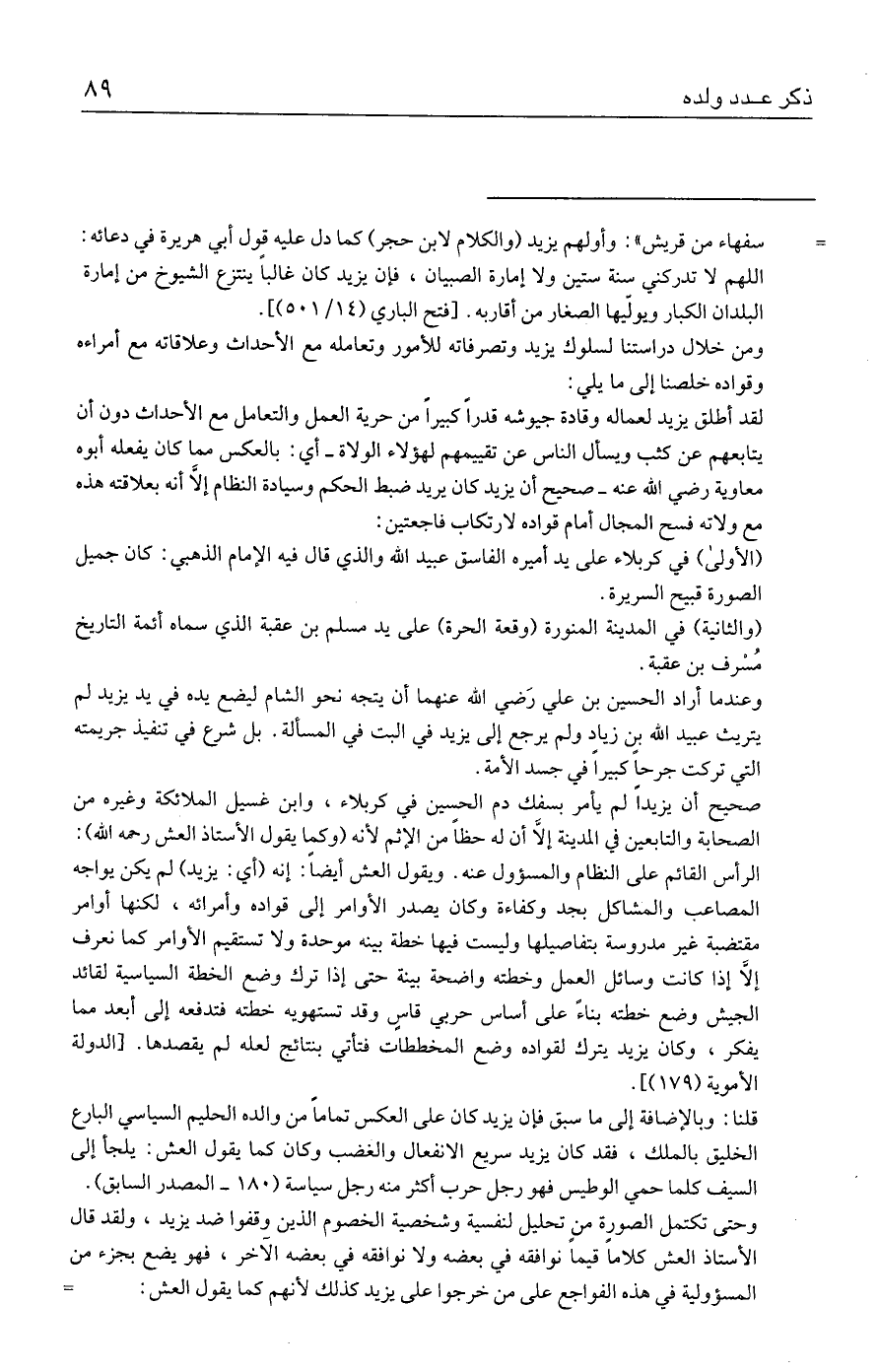 صحيح أن يزيدًا لم يأمر بسفك دم الحسين في كربلاء، وابن غسيل الملائكة وغيره من الصحابة والتابعين في المدينة إلَّا أن له حظًا من الإثم لأنه (وكما يقول الأستاذ العش رحمه الله): الرأس القائم على النظام والمسؤول عنه. ويقول العش أيضًا: إنه (أي: يزيد) لم يكن يواجه المصاعب والمشاكل بجد وكفاءة وكان يصدر الأوامر إلى قواده وأمرائه، لكنها أوامر مقتضبة غير مدروسة بتفاصيلها وليست فيها خطة بينه موحدة ولا تستقيم الأوامر كما نعرف إلَّا إذا كانت وسائل العمل وخطته واضحة بينة حتى إذا ترك وضع الخطة السياسية لقائد الجيش وضع خطته بناءً على أساس حربي قاسٍ وقد تستهويه خطته فتدفعه إلى أبعد مما يفكر، وكان يزيد يترك لقواده وضع المخططات فتأتي بنتائج لعله لم يقصدها. [الدولة الأموية (١٧٩)].