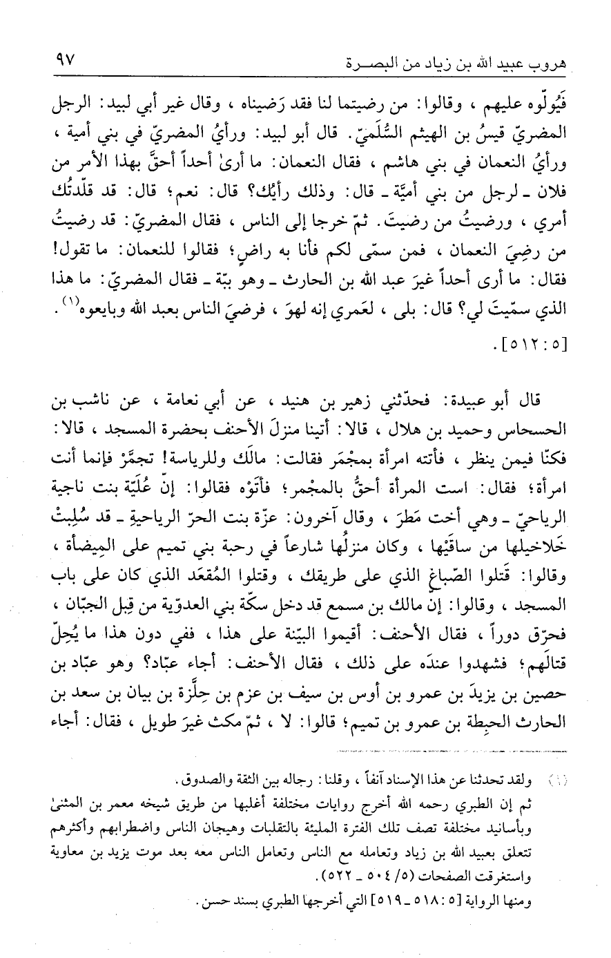 ثم إن الطبري رحمه الله أخرج روايات مختلفة أغلبها من طريق شيخه معمر بن المثنى وبأسانيد مخنلفة تصف تلك الفترة المليئة بالتقلبات وهيجان الناس واضطرابهم وأكثرهم تتعلق بعبيد الله بن زياد وتعامله مع الناس وتعامل الناس معه بعد موت يزيد بن معاوية واستغرقت الصفحات (٥/ ٥٠٤ - ٥٢٢).