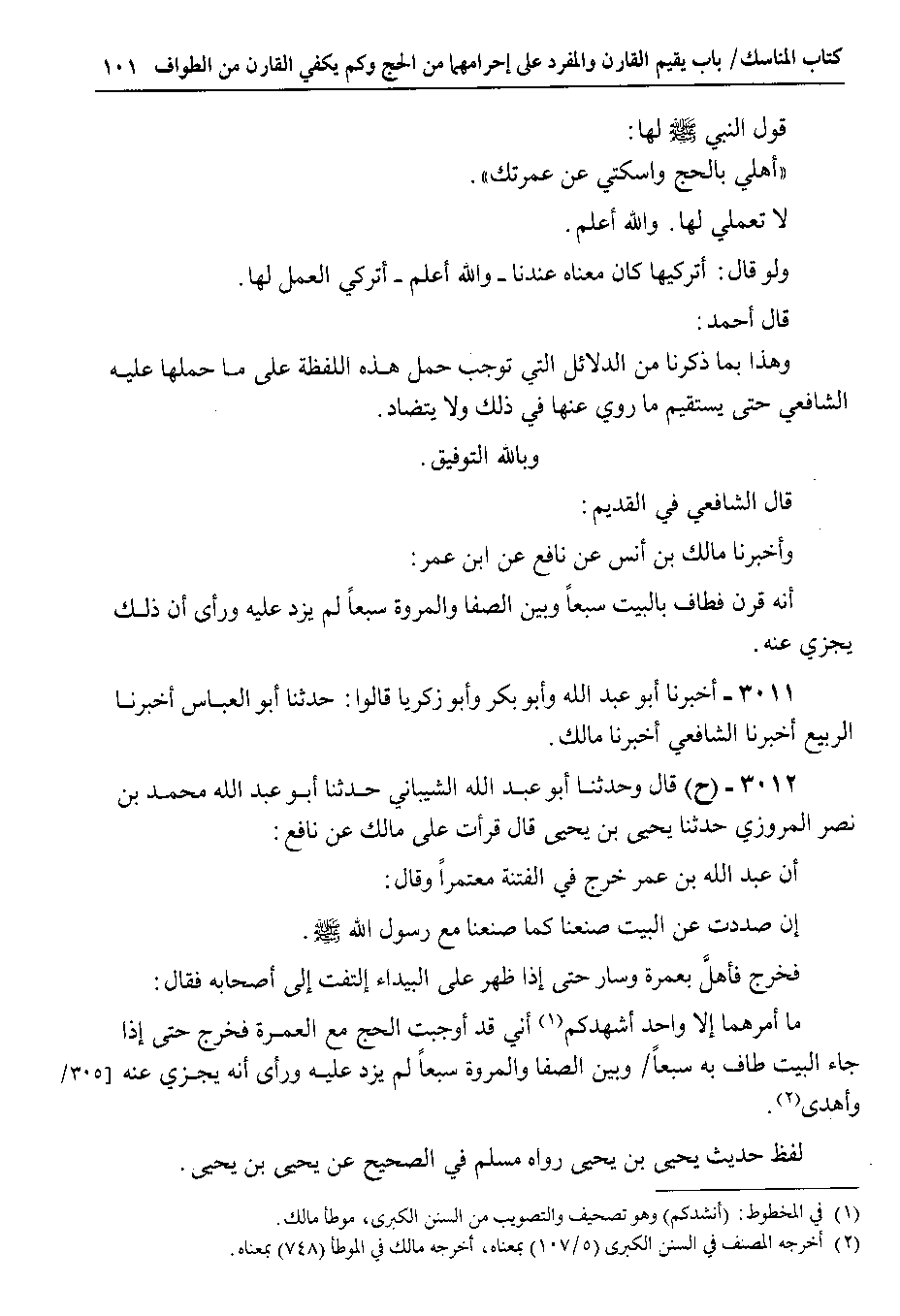 قال الشافعي في القديم وأخبرنا مالك بن أنس عن نافع عن ابن عمر أنه قرن فطاف بالبيت سبعاً وبين الصفا والمروة سبعاً لم يزد عليه ورأى أن ذلك يجزي عنه.
