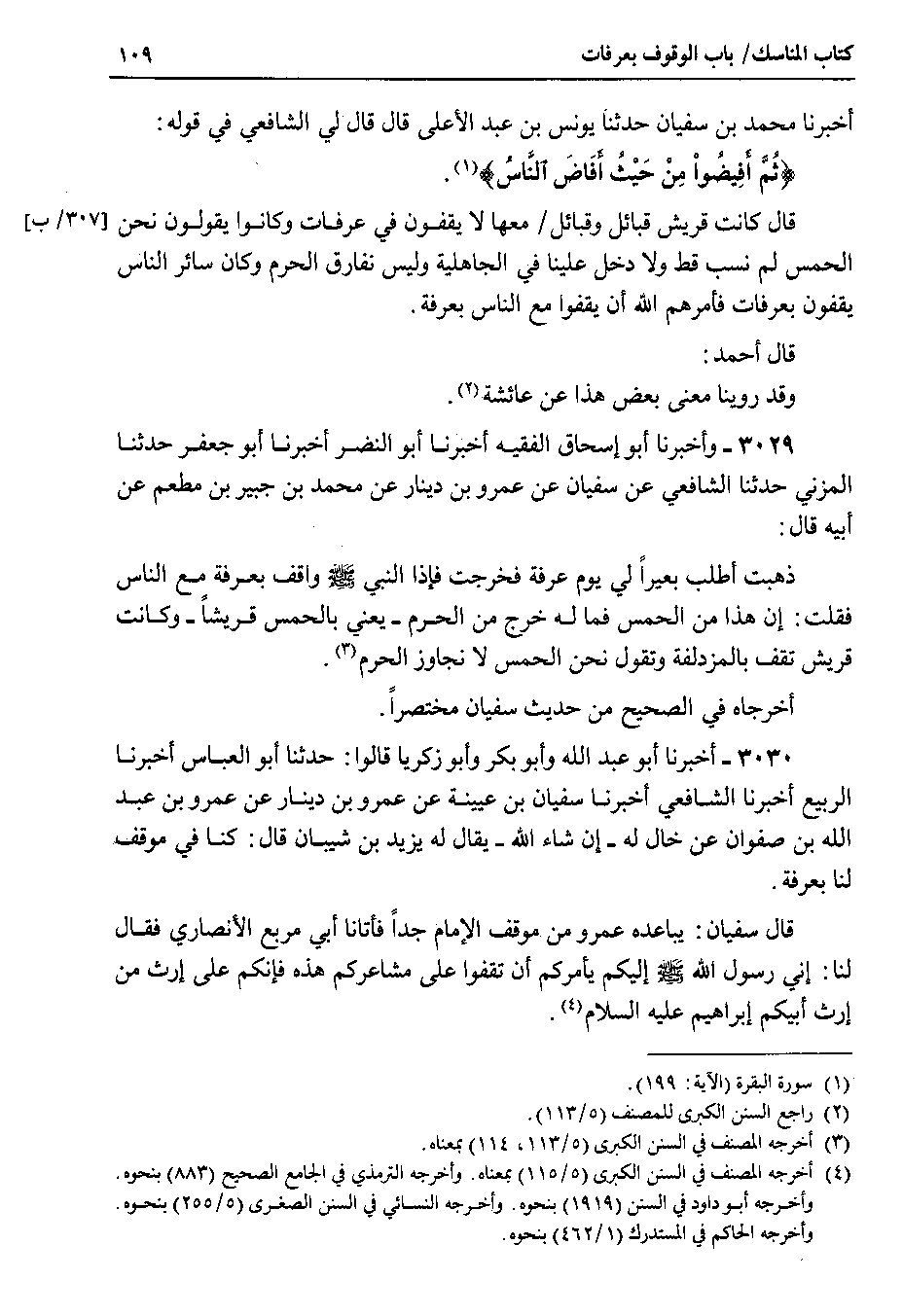 3029 - وأخبرنا أبو إسحاق الفقيه أخبرنا أبو النضر أخبرنا أبو جعفر حدثنا المزني حدثنا الشافعي عن سفيان عن عمرو بن دينار عن محمد بن جبير بن مطعم عن أبيه قال ذهبت أطلب بعيراً لي يوم عرفة فخرجت فإذا النبي صلى الله عليه وسلم واقف بعرفة مع الناس فقلت : إن هذا من الحمس فما له خرج من الحرم - يعني بالحمس قريشاً - وكانت قريش تقف بالمزدلفة وتقول نحن الحمس لا نجاوز الحرم.