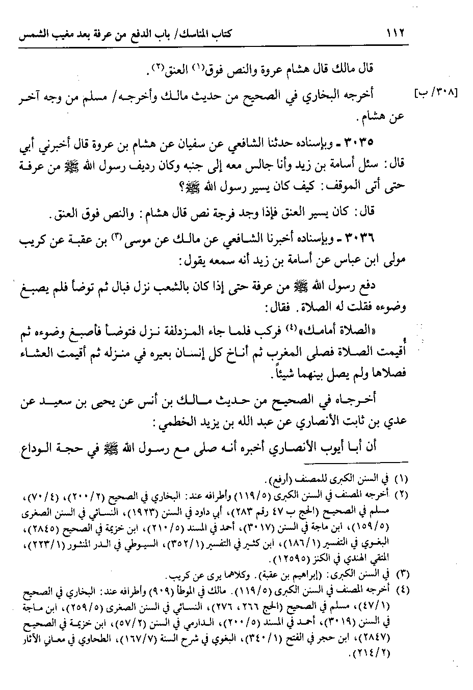 3036 - وبإسناده أخبرنا الشافعي عن مالك عن موسى بن عقبة عن كريب مولى ابن عباس عن أسامة بن زيد أنه سمعه يقول دفع رسول الله صلى الله عليه وسلم من عرفة حتى إذا كان بالشعب نزل فبال ثم توضأ فلم يصبغ وضوءه فقلت له الصلاة . فقال الصلاة أمامك فركب فلما جاء المزدلفة نزل فتوضأ فأصبغ وضوءه ثم أقيمت الصلاة فصلى المغرب ثم أناخ كل إنسان بعيره في منزله ثم أقيمت العشاء فصلاها ولم يصل بينهما شيئاً.