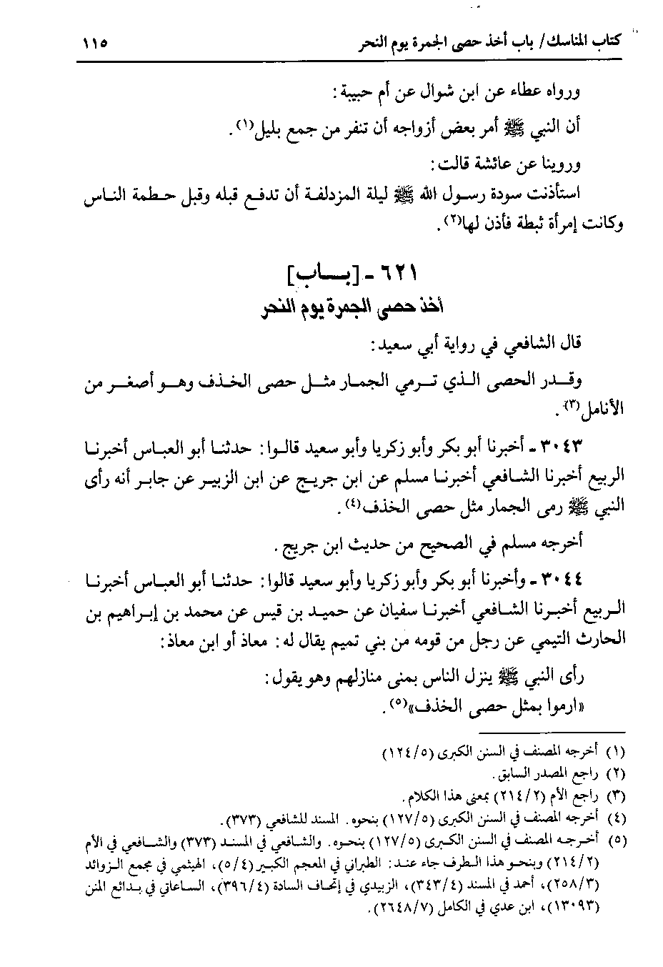 3043 - أخبرنا أبو بكر وأبو زكريا وأبو سعيد قالوا : حدثنا أبو العباس أخبرنا الربيع أخبرنا الشافعي أخبرنا مسلم عن ابن جريج عن ابن الزبير عن جابر أنه رأى النبي صلى الله عليه وسلم رمى الجمار مثل حصى الخذف.