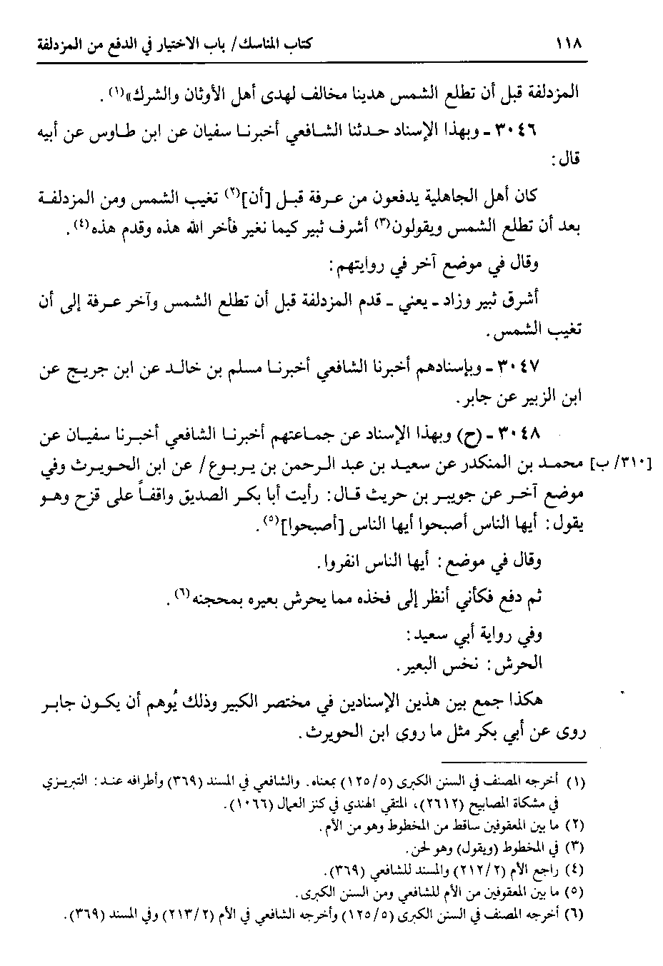 3046 - وبهذا الإسناد حدثنا الشافعي أخبرنا سفيان عن ابن طاووس عن أبيه قال كان أهل الجاهلية يدفعون من عرفة قبل أن تغيب الشمس ومن المزدلفة بعد أن تطلع الشمس ويقولون أشرف ثبير كيما نغير فأخر الله هذه وقدم هذه.