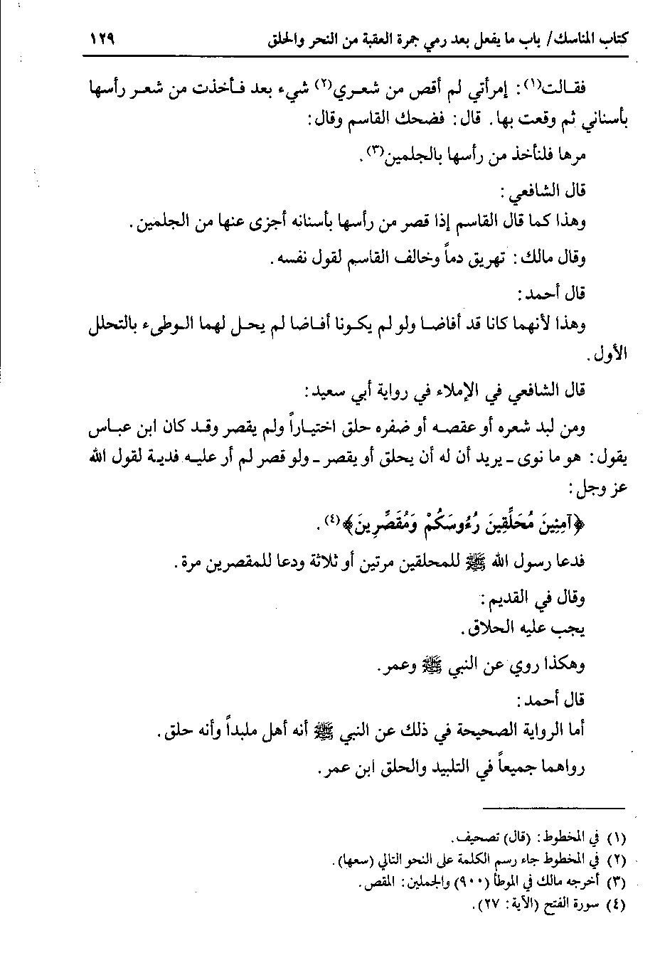 فقالت : إمرأتي لم أقص من شعري شيء بعد فأخذت من شعر رأسها بأسناني ثم وقعت بها . قال : فضحك القاسم وقال : مرها فلنأخذ من رأسها بالجلمين.