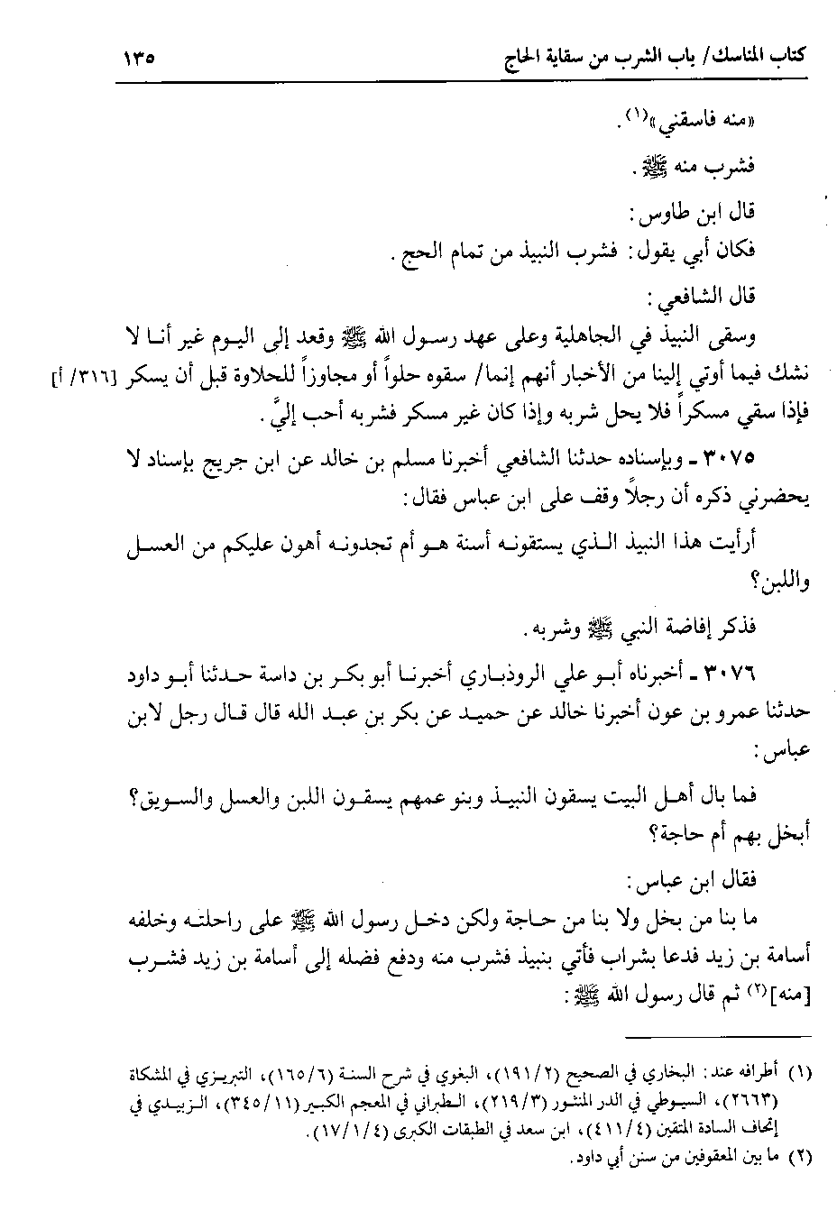 3075 - وبإسناده حدثنا الشافعي أخبرنا مسلم بن خالد عن ابن جريج بإسناد لا يحضرني ذكره أن رجلاً وقف على ابن عباس فقال : أرأيت هذا النبيذ الذي يستقونه أسنة هو أم تجدونه أهون عليكم من العسل واللبن ؟ فذكر إفاضة النبي صلى الله عليه وسلم وشربه.