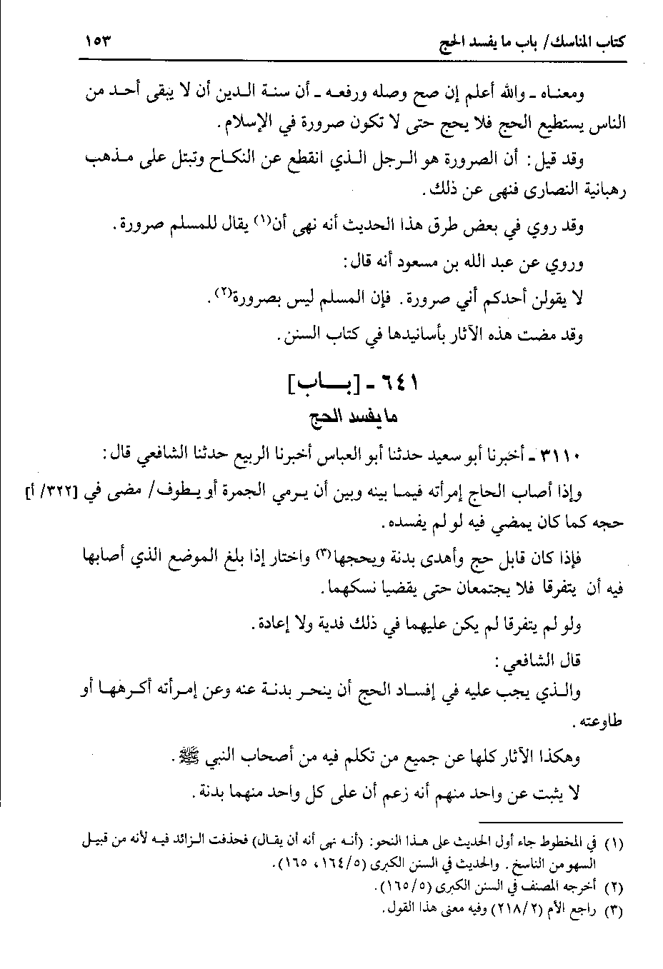 3110 - أخبرنا أبو سعيد حدثنا أبو العباس أخبرنا الربيع حدثنا الشافعي قال وإذا أصاب الحاج إمرأته فيما بينه وبين أن يرمي الجمرة أو يطوف مضى في حجه كما كان يمضي فيه لو لم يفسده.