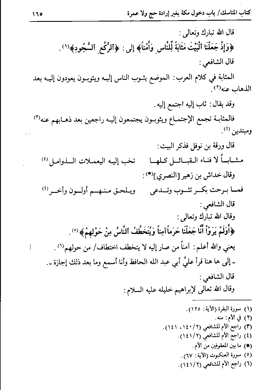 قال ورقة بن نوفل فذكر البيت % ( مثاباً لا فناء القبائل كلها % تخب إليه اليعملات الذوامل ) % وقال خداش بن زهير النصري % ( فما برحت بكر تثوب وتدعى % ويلحق منهم أولون وآخر ) % قال الشافعي وقال الله تبارك وتعالى {أولم يروا أنا جعلنا حرماً آمناً ويتخطف الناس من حولهم}.