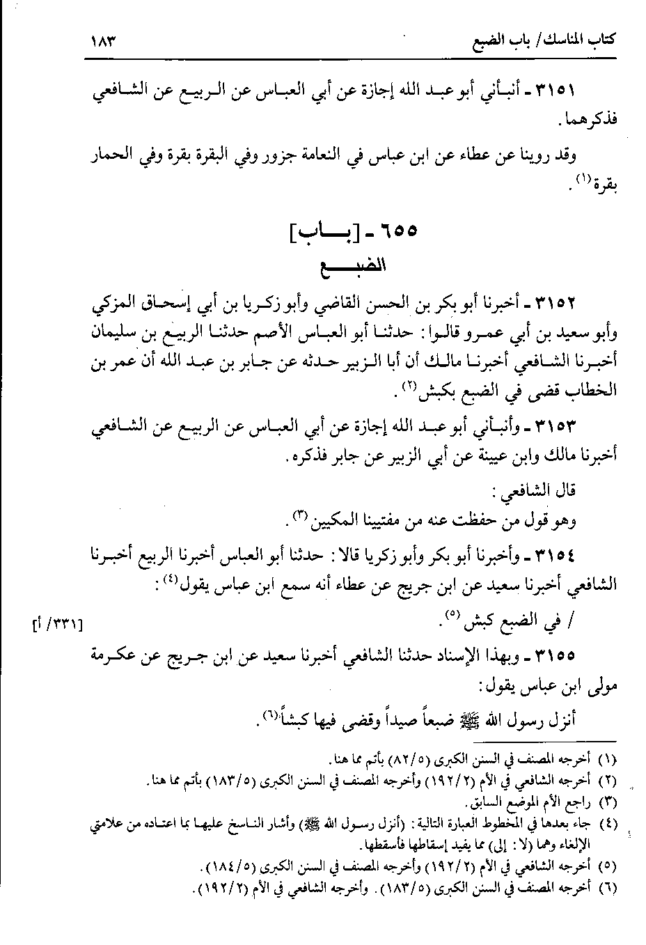 3155 - وبهذا الإسناد حدثنا الشافعي أخبرنا سعيد عن ابن جريج عن عكرمة مولى ابن عباس يقول أنزل رسول الله صلى الله عليه وسلم ضبعاً صيداً وقضى فيها كبشاً.