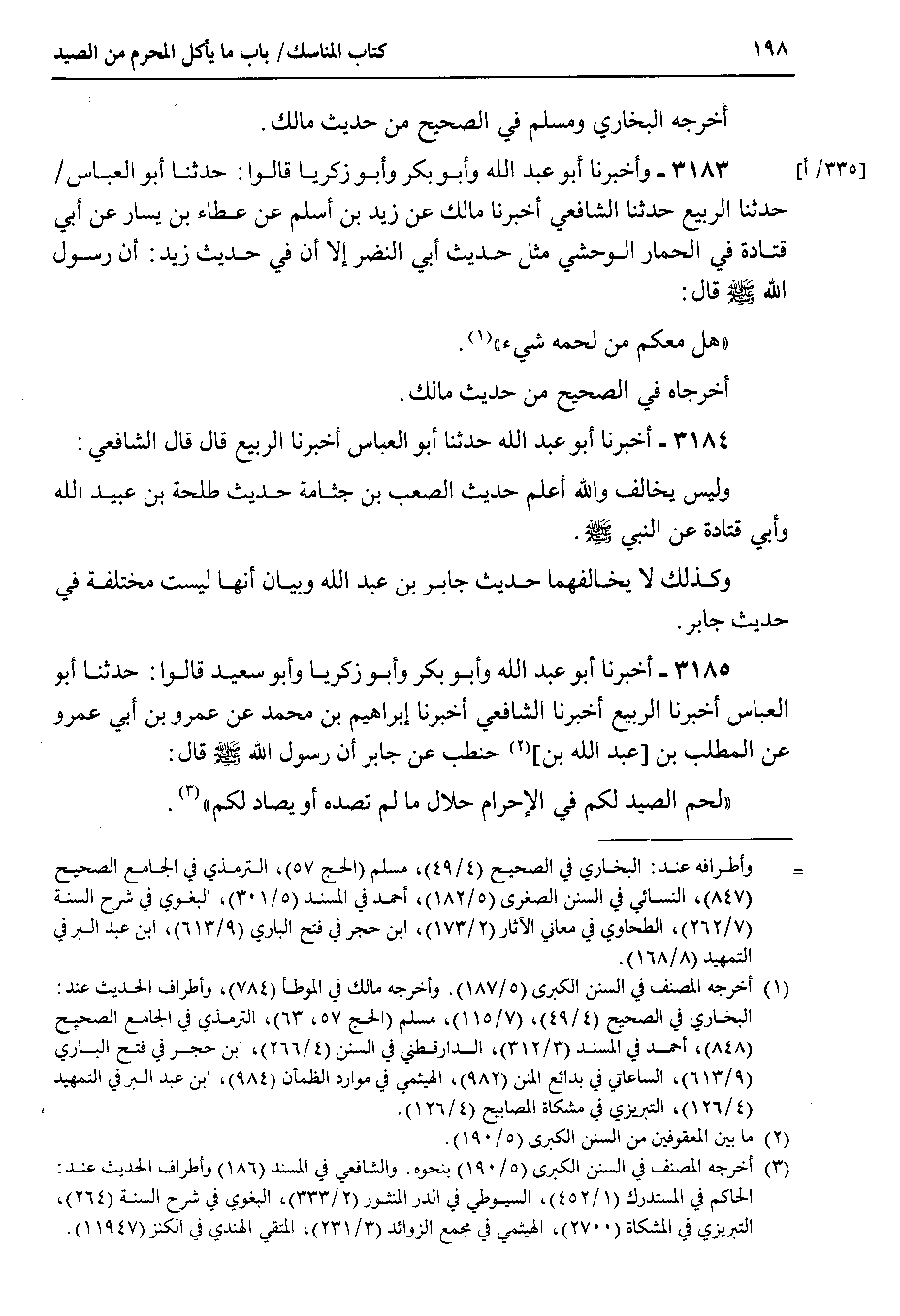 3183 - وأخبرنا أبو عبد الله وأبو بكر وأبو زكريا قالوا : حدثنا أبو العباس حدثنا الربيع حدثنا الشافعي أخبرنا مالك عن زيد بن أسلم عن عطاء بن يسار عن أبي قتادة في الحمار الوحشي مثل حديث أبي النضر إلا أن في حديث زيد : أن رسول الله صلى الله عليه وسلم قال هل معكم من لحمه شيء.