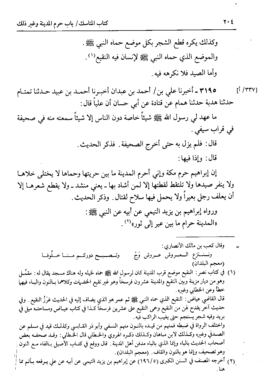 قال : وإذا فيها إن إبراهيم حرم مكة وإني أحرم المدينة ما بين حريتها وحماها لا يختلى خلاها ولا ينفر صيدها ولا تلتقط لقطتها إلا لمن أشاد بها _ يعني منشد _ ولا يقطع شعرها إلا أن يعلف رجل بعيراً ولا يحمل فيها سلاح لقتال . وذكر الحديث.
