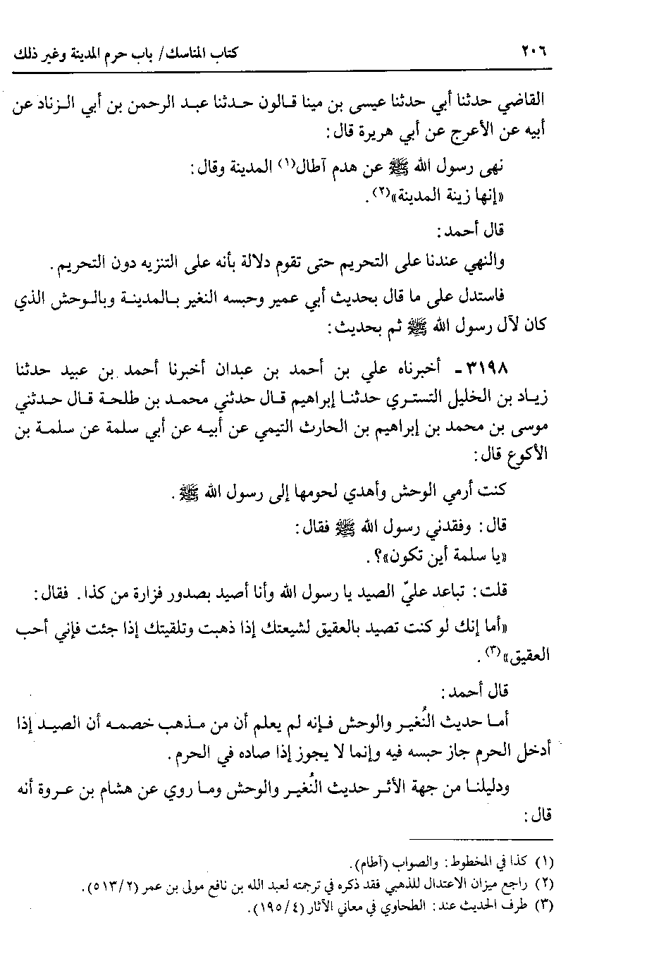 فاستدل على ما قال بحديث أبي عمير وحبسه النغير بالمدينة وبالوحش الذي كان لآل رسول الله صلى الله عليه وسلم ثم بحديث 3198 - أخبرناه علي بن أحمد بن عبدان أخبرنا أحمد بن عبيد حدثنا زياد بن الخليل التستري حدثنا إبراهيم قال حدثني محمد بن طلحة قال حدثني موسى بن محمد بن إبراهيم بن الحارث التيمي عن أبيه عن أبي سلمة عن سلمة بن الأكوع قال كنت أرمي الوحش وأهدي لحومها إلى رسول الله صلى الله عليه وسلم.