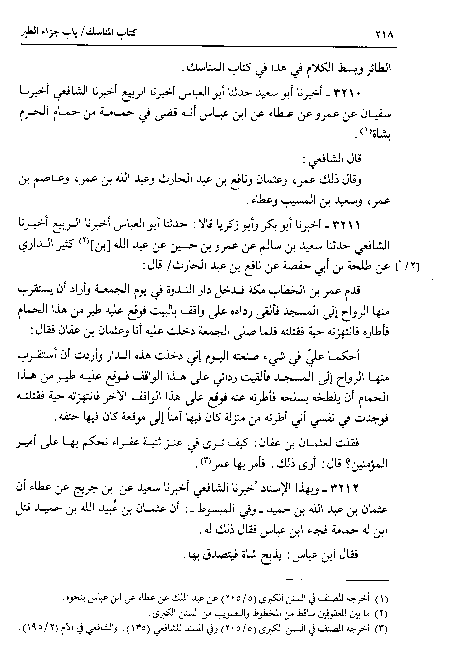 3212 - وبهذا الإسناد أخبرنا الشافعي أخبرنا سعيد عن ابن جريج عن عطاء أن عثمان بن عبد الله بن حميد _ وفي المبسوط _ : أن عثمان بن عبيد الله بن حميد قتل ابن له حمامة فجاء ابن عباس فقال ذلك له.