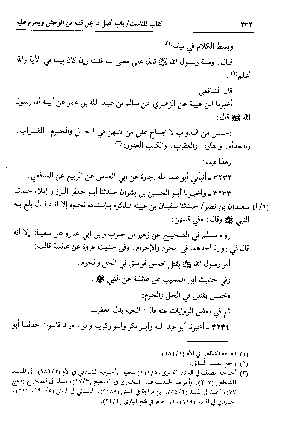 قال الشافعي أخبرنا ابن عيينة عن الزهري عن سالم بن عبد الله بن عمر عن أبيه أن رسول الله صلى الله عليه وسلم قال خمس من الدواب لا جناح على من قتلهن في الحل والحرم : الغراب . والحدأة . والفأرة . والعقرب . والكلب العقور.
