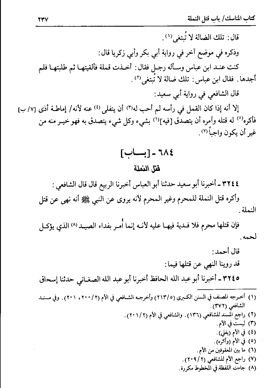 3244 - أخبرنا أبو سعيد حدثنا أبو العباس أخبرنا الربيع قال قال الشافعي وأكره قتل النملة للمحرم وغير المحرم لأنه يروى عن النبي صلى الله عليه وسلم أنه نهى عن قتل النملة.