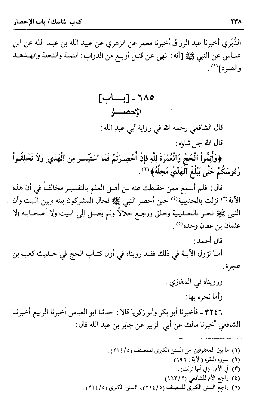 قال الشافعي رحمه الله في رواية أبي عبد الله قال الله جل ثناؤه {وأتموا الحج والعمرة لله فإن أحصرتم فما استيسر من الهدي ولا تحلقوا رءوسكم حتى يبلغ الهدي محله} قال : فلم أسمع ممن حفطت عنه من أهل العلم بالتفسير مخالفاً في أن هذه الآية نزلت بالحديبية حين أحصر النبي صلى الله عليه وسلم فحال المشركون بينه وبين البيت وأن النبي صلى الله عليه وسلم نحر بالحديبية وحلق ورجع حلالاً ولم يصل إلى البيت ولا أصحابه إلا عثمان بن عفان وحده.