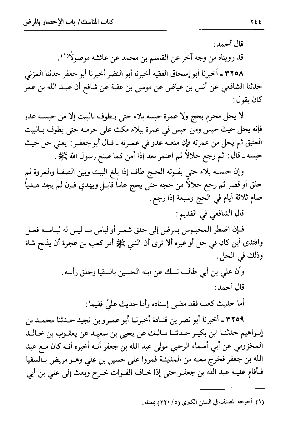 3258 - أخبرنا أبو إسحاق الفقيه أخبرنا أبو النضر أخبرنا أبو جعفر حدثنا المزني حدثنا الشافعي عن أنس بن عياض عن موسى بن عقبة عن شافع أن عبد الله بن عمر كان يقول لا يحل محرم بحج ولا عمرة حبسه بلاء حتى يطوف بالبيت إلا من حبسه عدو فإنه يحل حيث حبس ومن حبس في عمرة ببلاء مكث على حرمه حتى يطوف بالبيت العتيق ثم يحل من عمرته فإن منعه عدو في عمرته - قال أبو جعفر : يعني حل حيث حبسه - قال : ثم رجع حلالاً ثم اعتمر بعد إذا أمن كما صنع رسول الله صلى الله عليه وسلم.