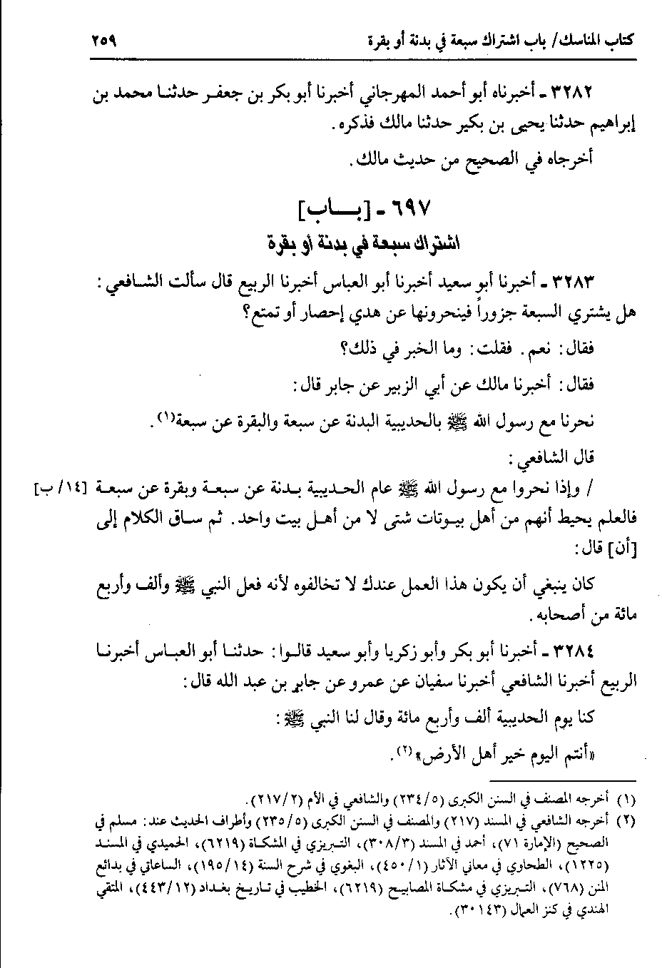 3283 - أخبرنا أبو سعيد أخبرنا أبو العباس أخبرنا الربيع قال سألت الشافعي هل يشتري السبعة جزوراً فينحرونها عن هدي إحصار أو تمتع ؟ فقال : نعم . فقلت : وما الخبر في ذلك ؟ فقال : أخبرنا مالك عن أبي الزبير عن جابر قال نحرنا مع رسول الله صلى الله عليه وسلم بالحديبية البدنة عن سبعة والبقرة عن سبعة.