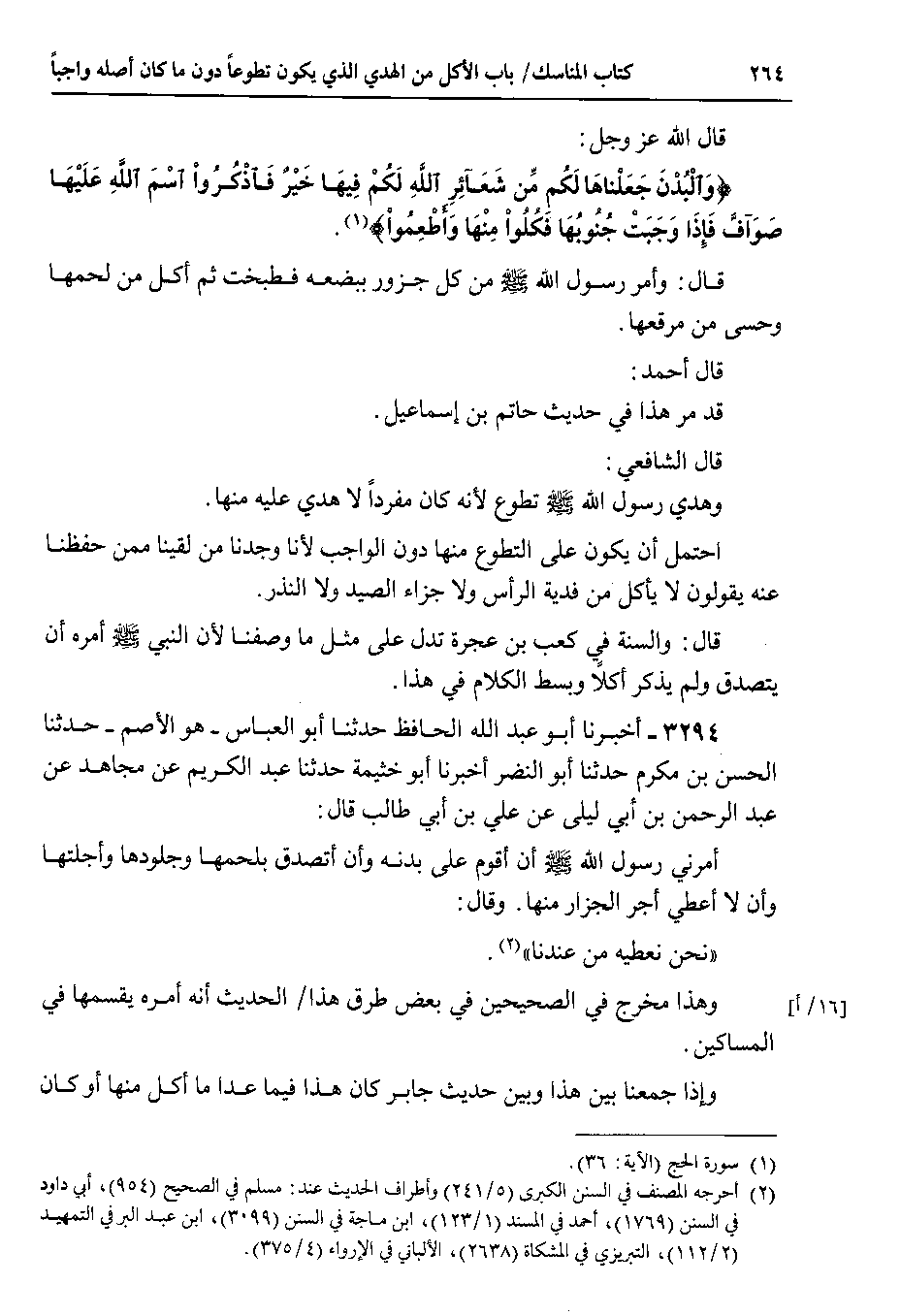 قال الله عز وجل {والبدن جعلناها لكم من شعائر الله لكم فيها خير فاذكروا اسم الله عليها صواف فإذا وجبت جنوبها فكلوا منها وأطعموا}.