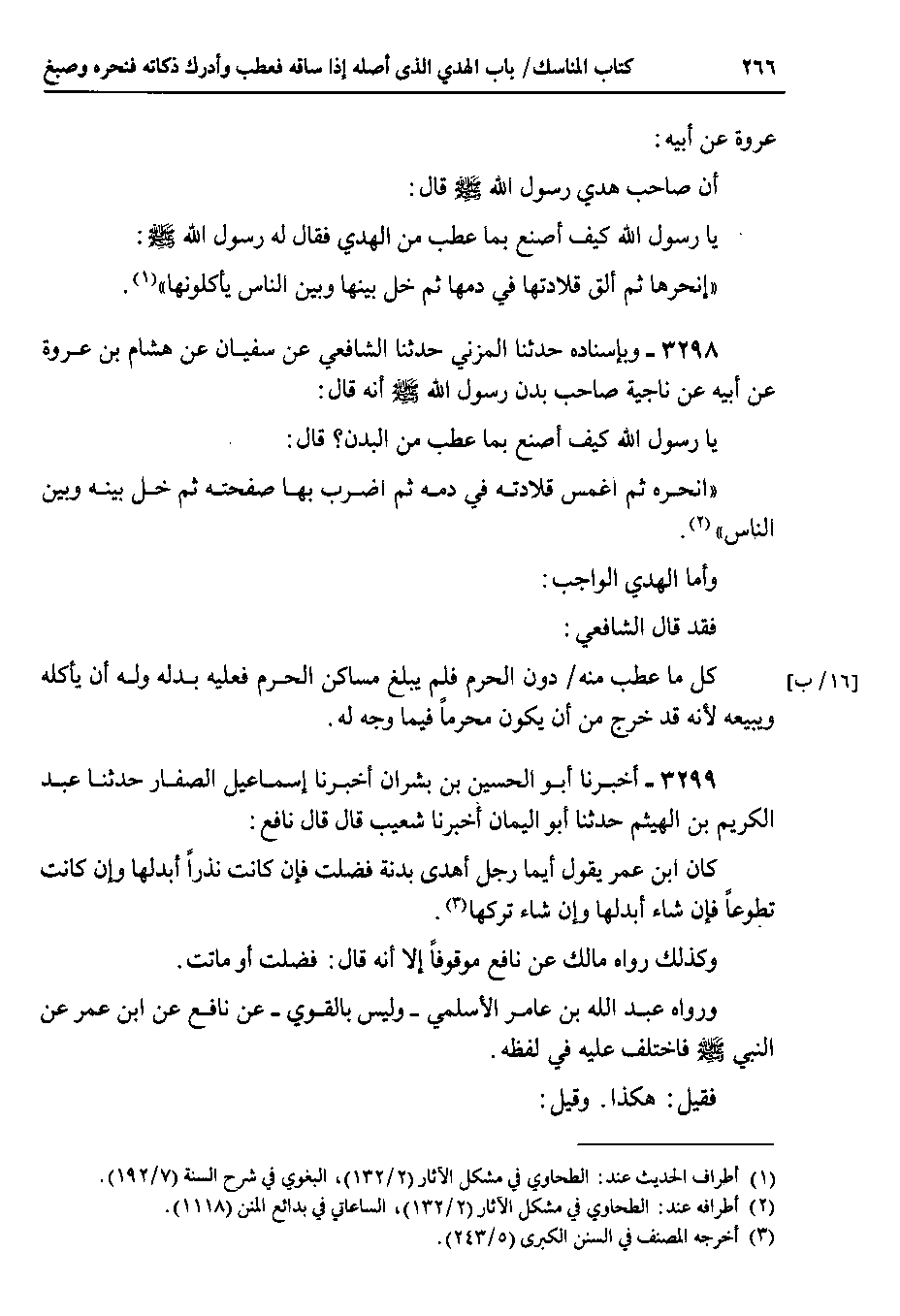 3298 - وبإسناده حدثنا المزني حدثنا الشافعي عن سفيان عن هشام بن عروة عن أبيه عن ناجية صاحب بدن رسول الله صلى الله عليه وسلم أنه قال يا رسول الله كيف أصنع بما عطب من البدن ؟ قال انحره ثم اغمس قلادته في دمه ثم اضرب بها صفحته ثم خل بينه وبين الناس.