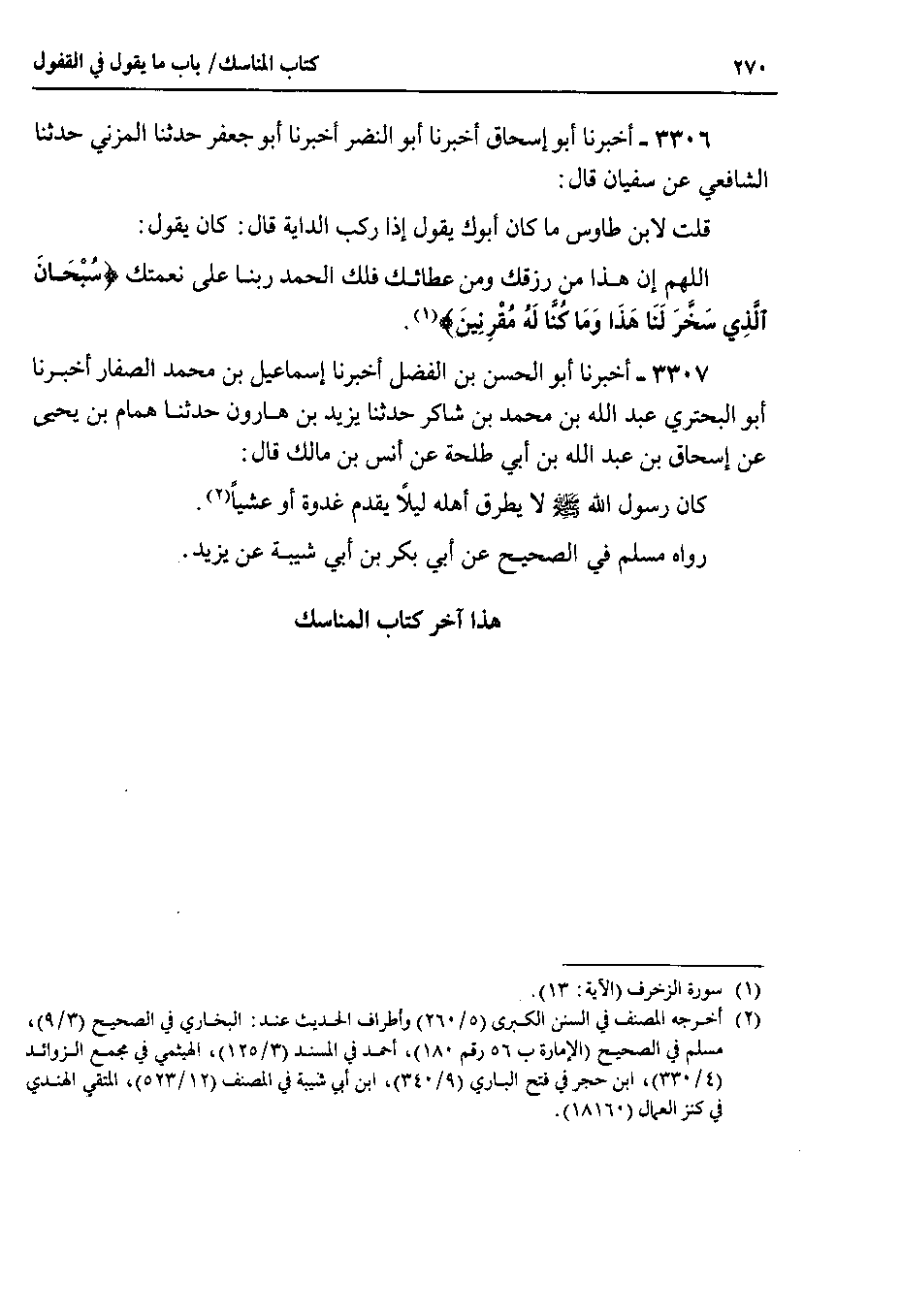 3306 - أخبرنا أبو إسحاق أخبرنا أبو النضر أخبرنا أبو جعفر حدثنا المزني حدثنا الشافعي عن سفيان قال قلت لابن طاووس ما كان أبوك يقول إذا ركب الداية قال : كان يقول اللهم إن هذا من رزقك ومن عطائك فلك الحمد ربنا على نعمتك {سبحان الذي سخر لنا هذا وما كنا له مقرنين}.